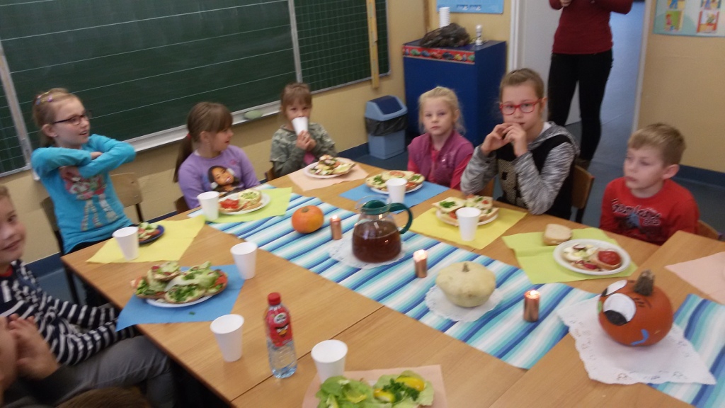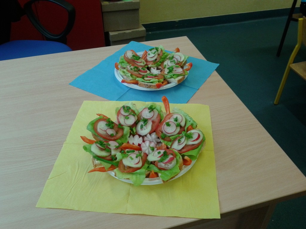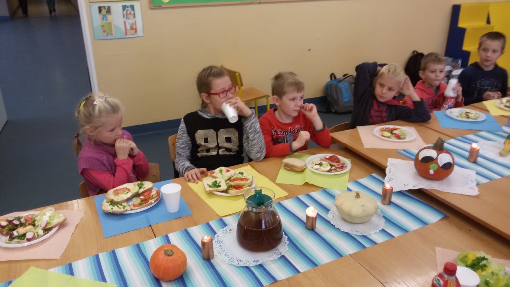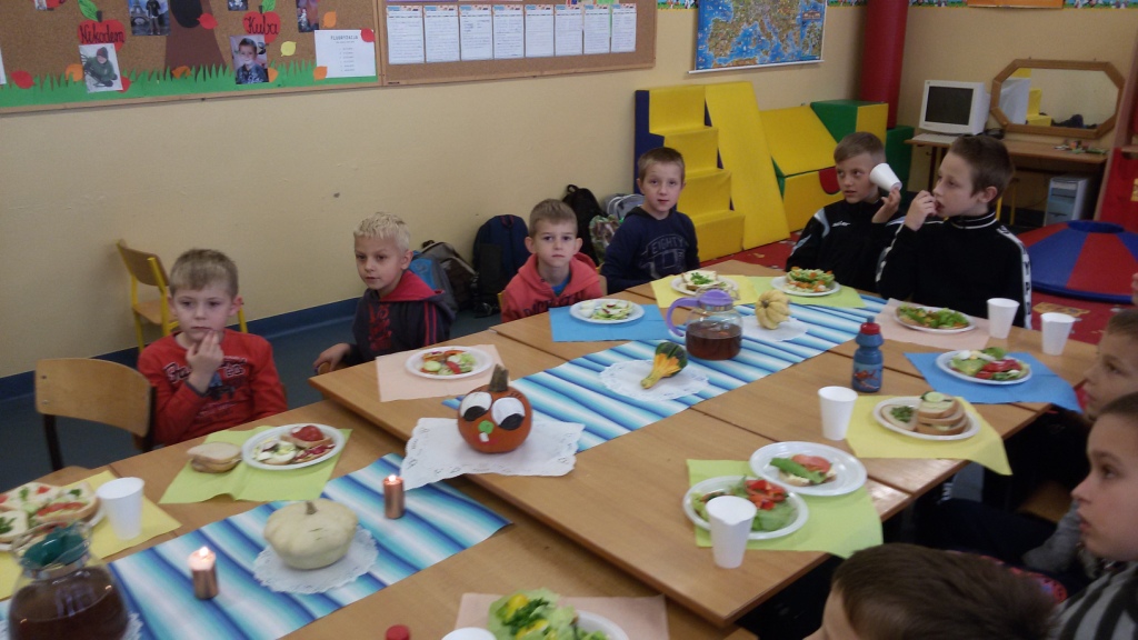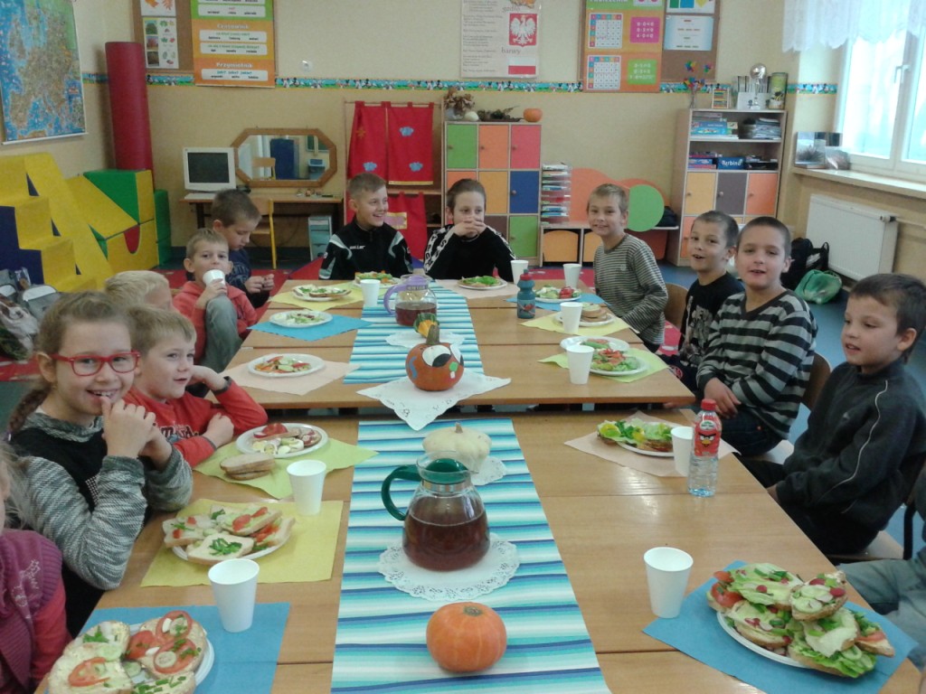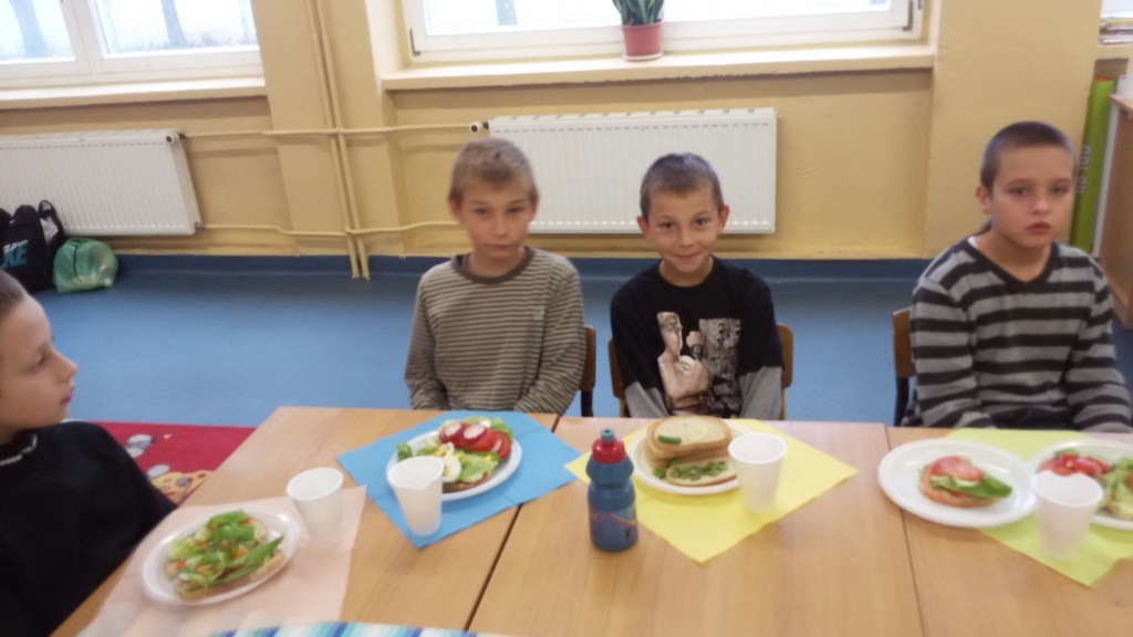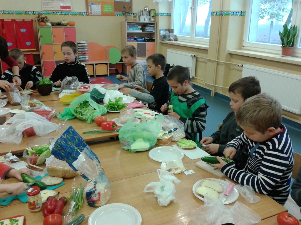 Dnia 31.10.2014 r. uczniowie klas I-III spotkali się, aby wspólnie przygotować zdrowe kanapki. Przed przystąpieniem do pracy dzieci zamieniły klasę w dużą „kuchnię”, a same stały się kucharzami. Zgodnie z zasadami obowiązującymi podczas przygotowywania posiłków rozpoczęły wykonywanie kanapek. Samodzielnie smarowały chleb, kroiły warzywa (pomidory, ogórki, rzodkiewkę, paprykę, szczypiorek). Po zakończonej pracy „kuchnię” uczniowie zamienili w restaurację - nakryli stoły, zaprosili Panią dyrektor i wszyscy przystąpili do degustacji. Było smacznie, kolorowo, a przede wszystkim ZDROWO.