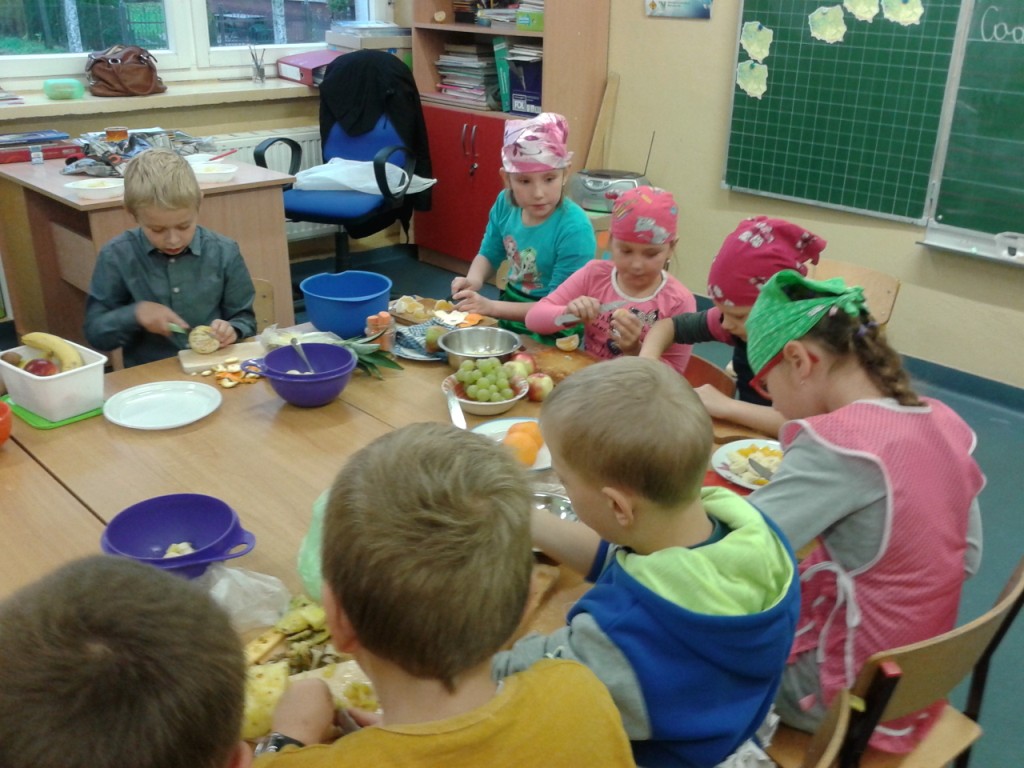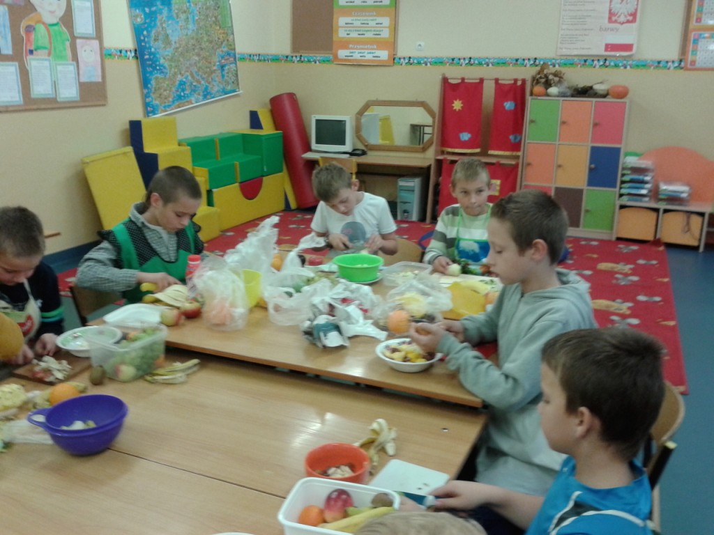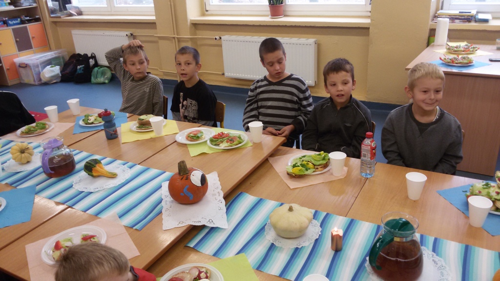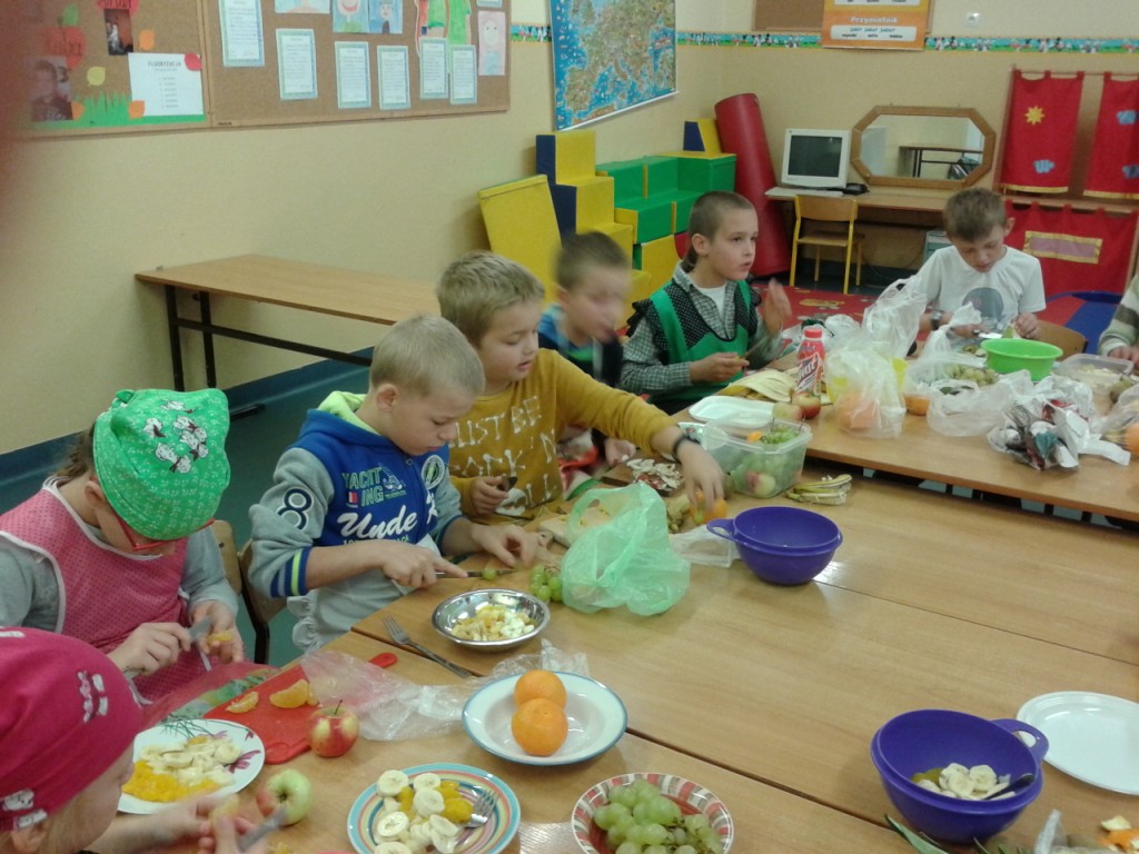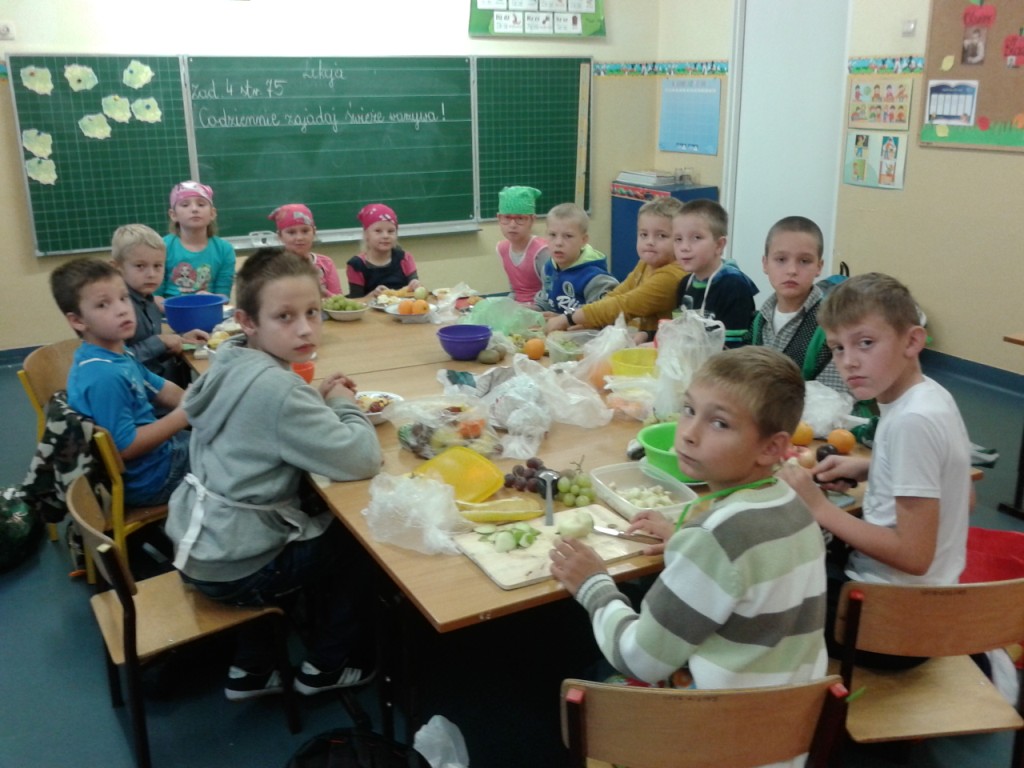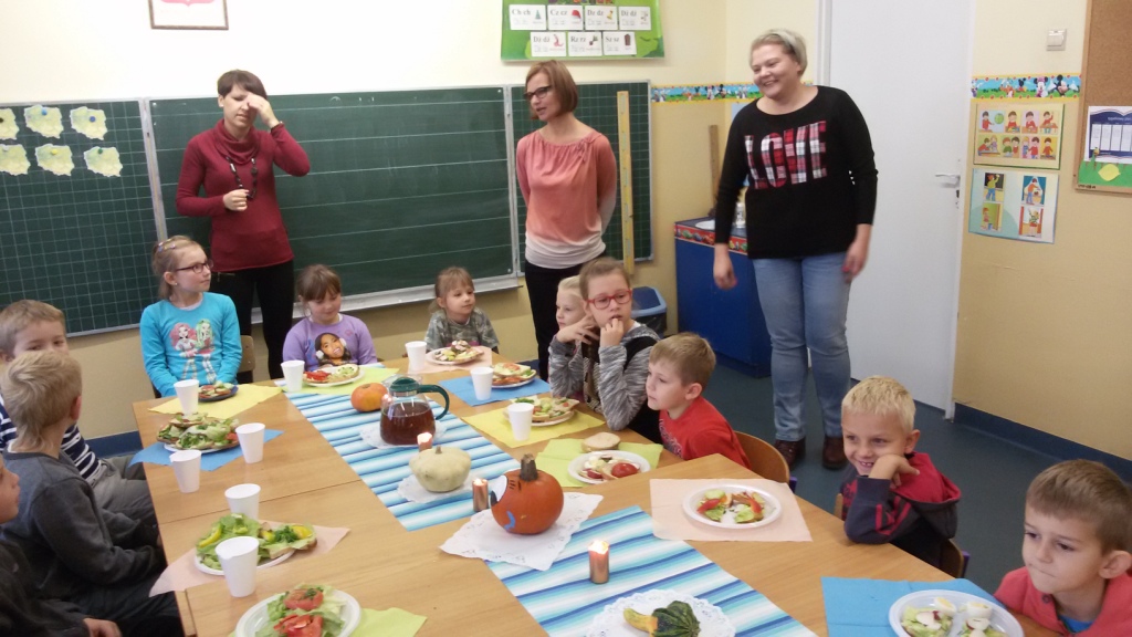 Dnia 31.10.2014 r. uczniowie klas I-III spotkali się, aby wspólnie przygotować zdrowe kanapki. Przed przystąpieniem do pracy dzieci zamieniły klasę w dużą „kuchnię”, a same stały się kucharzami. Zgodnie z zasadami obowiązującymi podczas przygotowywania posiłków rozpoczęły wykonywanie kanapek. Samodzielnie smarowały chleb, kroiły warzywa (pomidory, ogórki, rzodkiewkę, paprykę, szczypiorek). Po zakończonej pracy „kuchnię” uczniowie zamienili w restaurację - nakryli stoły, zaprosili Panią dyrektor i wszyscy przystąpili do degustacji. Było smacznie, kolorowo, a przede wszystkim ZDROWO.