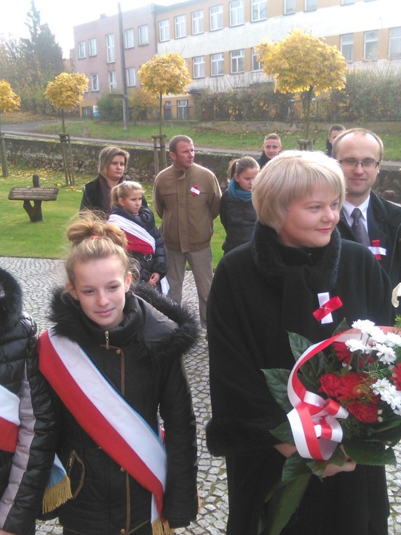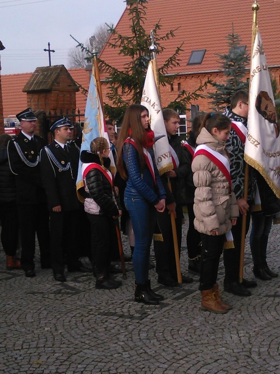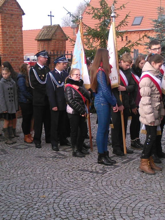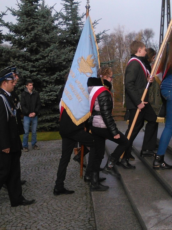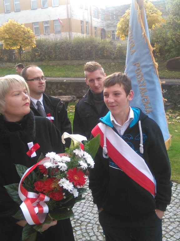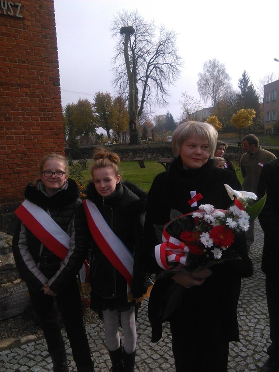 Poczet Sztandarowy, w składzie: Kasia Michałowska, Emilka Nuszczyńska, Arek Biskup, dumnie wypełniał swoje obowiązki podczas nabożeństwa za naszą Ojczyznę, a także podczas ceremoniału przed pomnikiem upamiętniającym patriotów polskich.