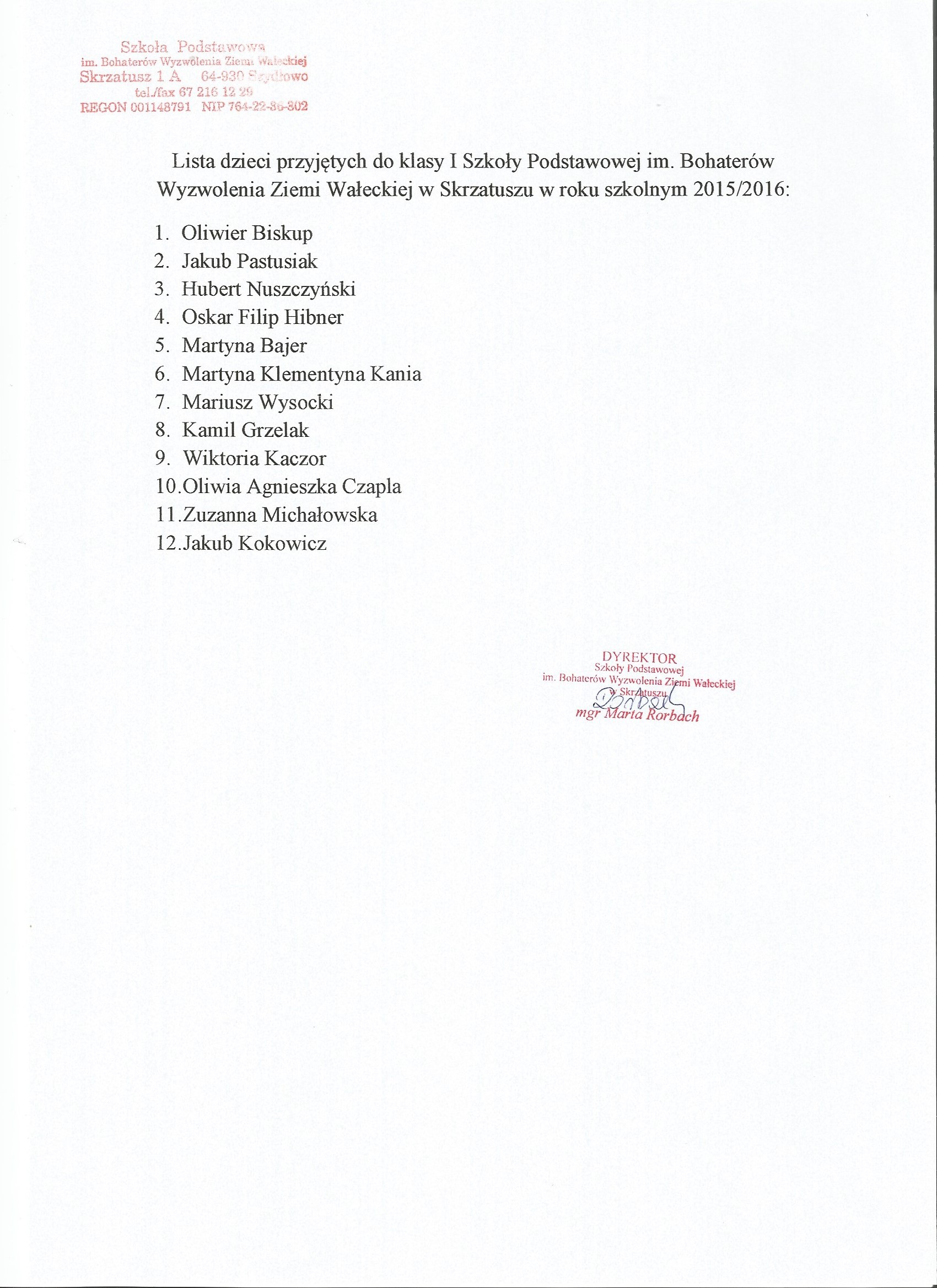 Lista uczniów przyjętych do klasy I w roku szkolnym 2015/2016