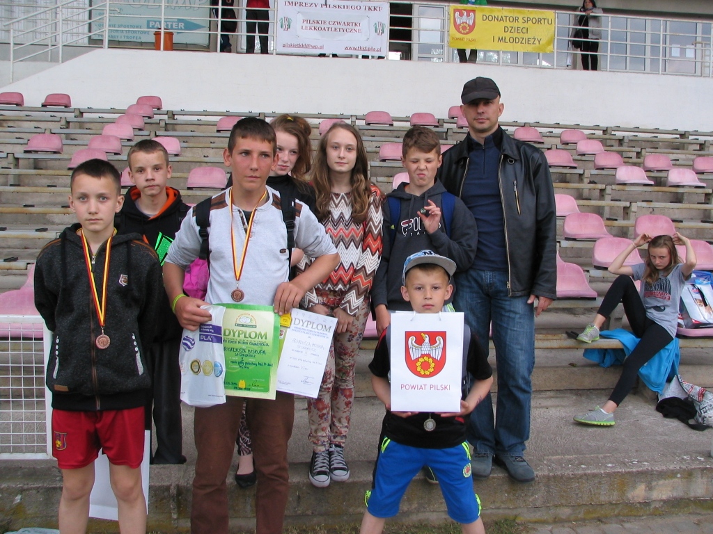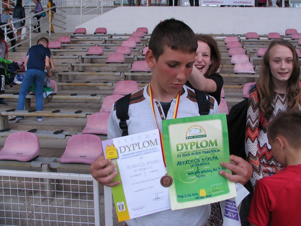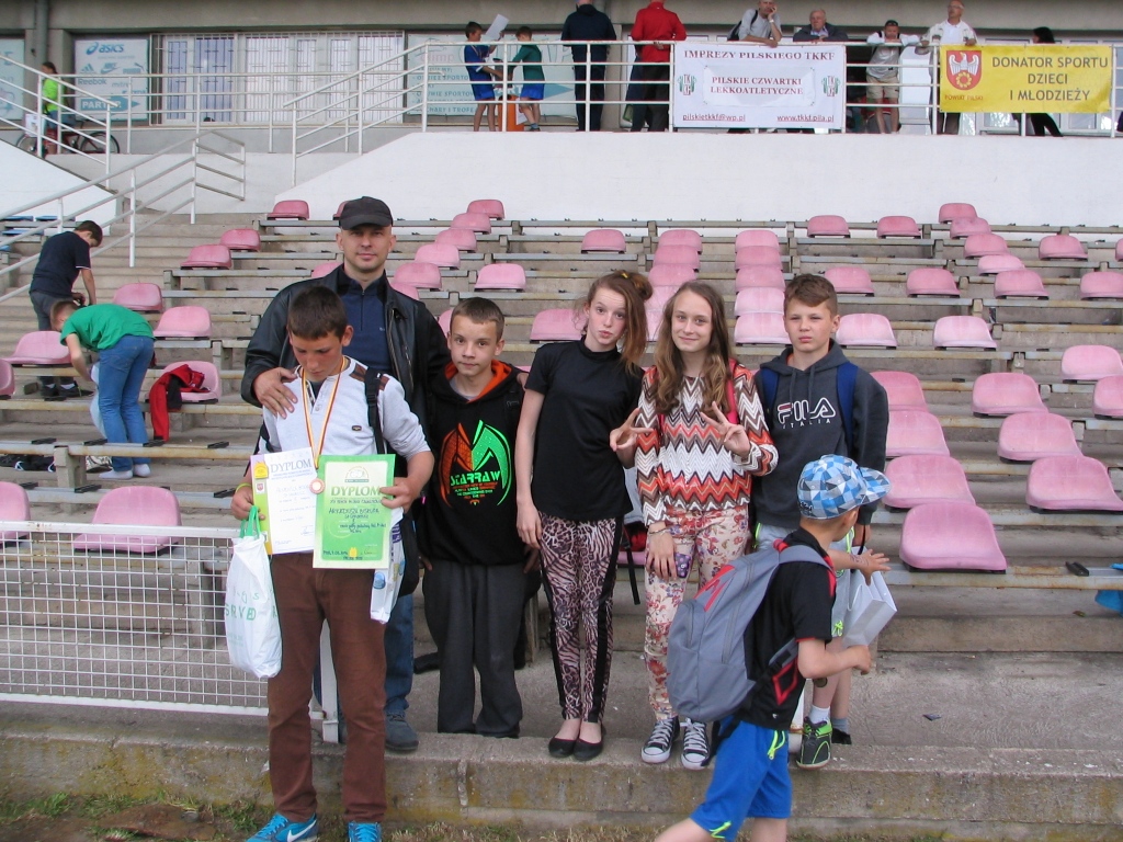 Na stadionie MOSiR-u w Pile odbył się finał Czwartków Lekkoatletycznych. Do Grand Prix Piły zakwalifikowało się z naszej szkoły siedem osób w tym sześć w podwójnych konkurencjach. Nasi uczniowie walczyli bardzo dzielnie, choć nie wszystkim udało się osiągnąć upragnione miejsca na podium. Srebrny medal zdobył w swojej kategorii wiekowej Michał Hartlieb w skoku w dal. Brąz zawisł na szyi Kacpra Wichy za bieg na 60 m. Tym samym kolorem może pochwalić się Arkadiusz Biskup w rzucie piłeczką palantową. Warte odnotowania są również czwarte miejsca Wojtka Cieślika w skoku w dal i biegu na 60 m w którym zabrakło jednej setnej sekundy do medalu. Również niewiele brakowało Emilii Nuszczyńskiej, która skończyła zawody na piątym miejscu zarówno w skoku w dal jak i biegu na 60 m. Gratulujemy !!!