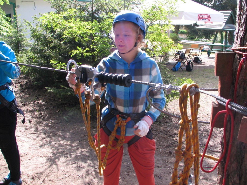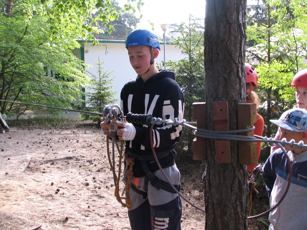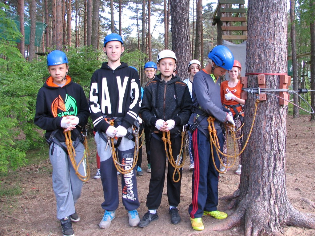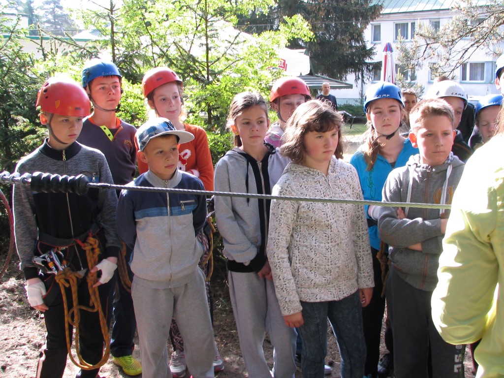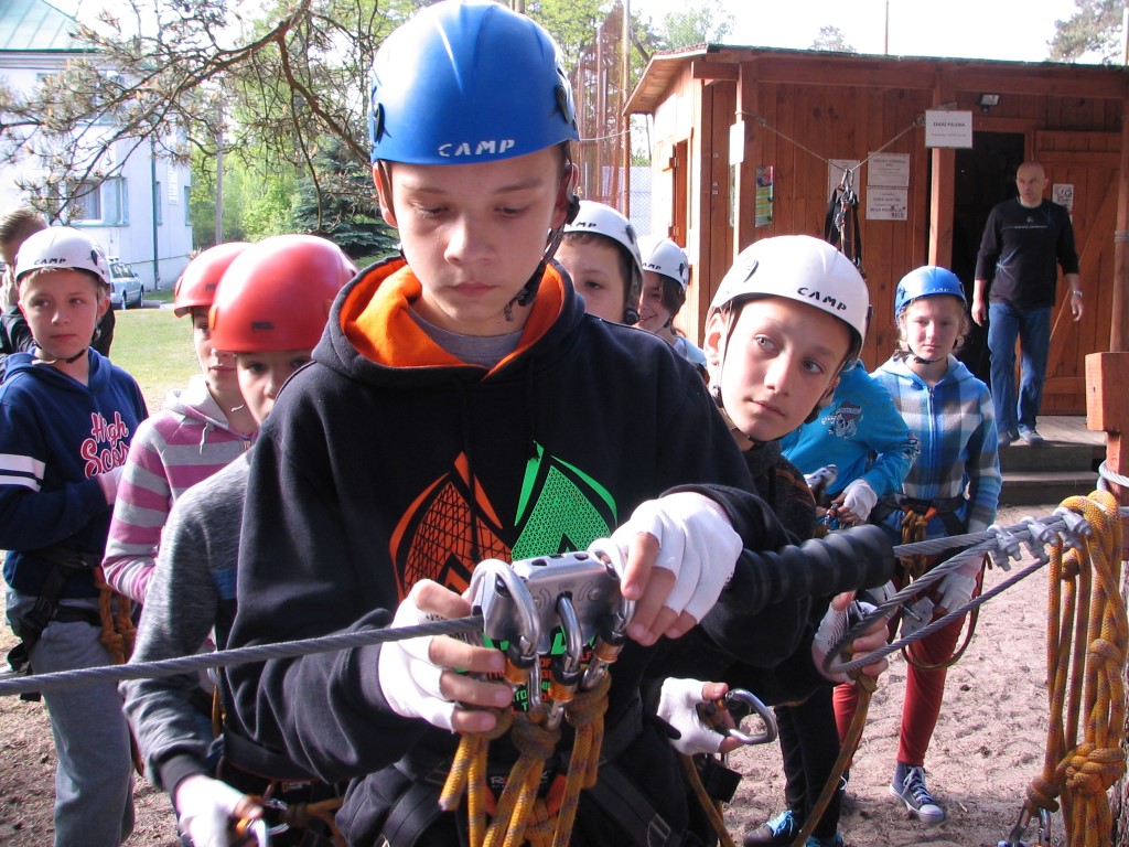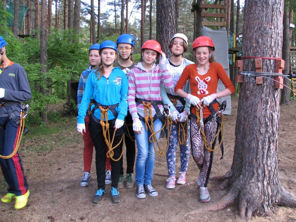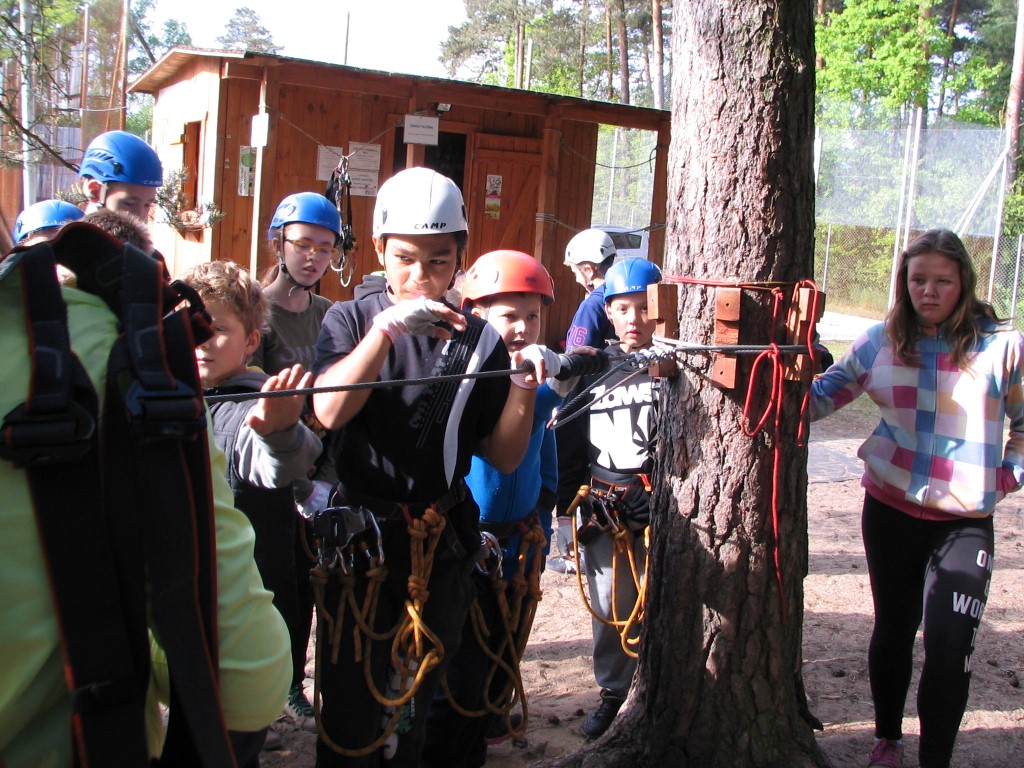 Niedawno wybraliśmy się na wycieczkę do Parku Linowego koło Piły. W tej wyprawie uczestniczyli prawie wszyscy uczniowie klas starszych ( IV-VI ). Celem tej wycieczki było spędzenie na łonie natury czasu, który dał nam możliwość nabrania pewności siebie, przełamania własnych słabości, poprawienia kondycji fizycznej, a wszystko to we wspaniałej scenerii sosnowego lasu. Uczestnicy mieli do dyspozycji trasę zieloną „Ścieżka pod reglami” , oraz trasę niebieską „Ścieżka nad reglami" . Czekały tam na nas różne atrakcje między innymi: trapezy, mosty birmańskie, kładki, ruchome belki, siatka, skok tarzana, mosty tyrolskie. Uczniowie przeszli podstawowe szkolenie alpinistyczne i ochoczo ruszyli przełamywać własne lęki. Dla większości z nich była to pierwsza tego typu atrakcja w życiu, ale jak sami stwierdzili „ z pewnością nie ostatnia”. Co niektórzy już po pokonaniu przeszkód czuli niedosyt i za niewielką dopłatą spróbowali swych sił jeszcze raz. Po trudach wspinaczki, zmęczeni, ale radośni i głodni poszliśmy na przygotowane dla nas ognisko, by uzupełnić pokłady energii. Kiełbasek było na tyle dużo, że nie byliśmy w stanie ich przejeść. Po posiłku wybraliśmy się nad jezioro „Płotki” na spacer po plaży. Dzieci nie mogąc doczekać się pełni lata moczyły swoje stopy w wodzie akwenu i podziwiały wspaniałe okazy ryb. Nie obyło się także bez gier i zabaw ruchowych na plaży. Chłopcy rozegrali mecz plażowej piłki nożnej, a dziewczęta turniej ringo. Zaliczyliśmy także wybudowany niedawno i oddany do użytku Plac Zabaw z prawdziwego zdarzenia. Opuściliśmy malownicze tereny w nadziei, że jeszcze kiedyś uda nam się spróbować swych sił w może jeszcze trudniejszych Parkach Linowych, których powstaje w naszym kraju coraz więcej.