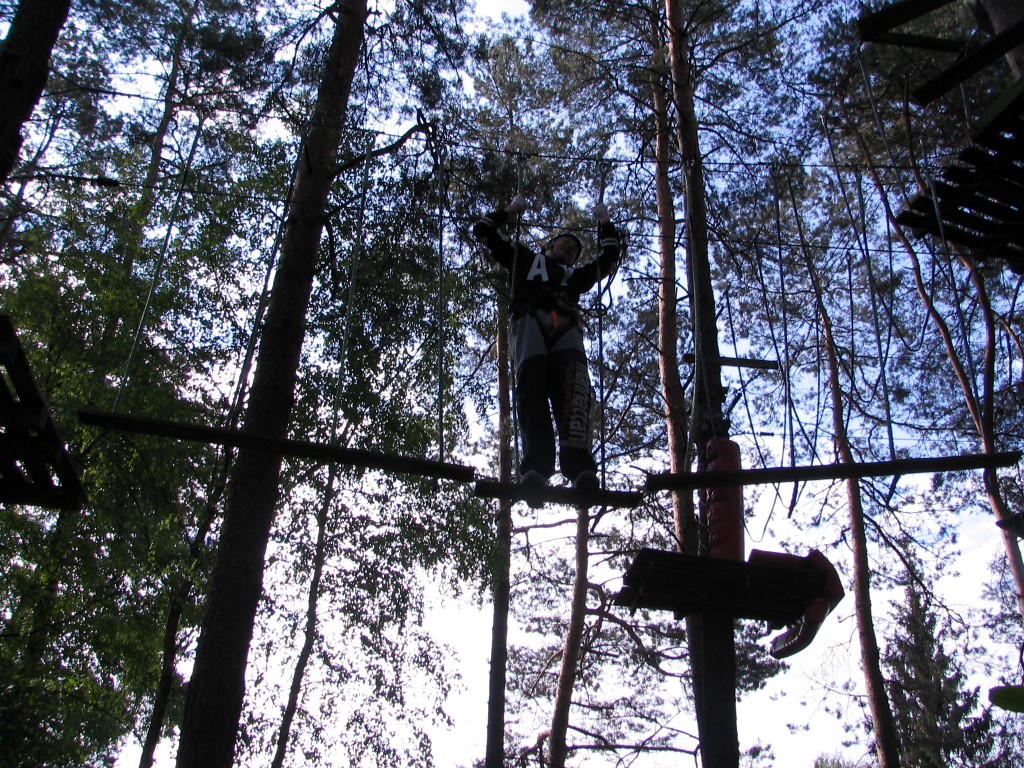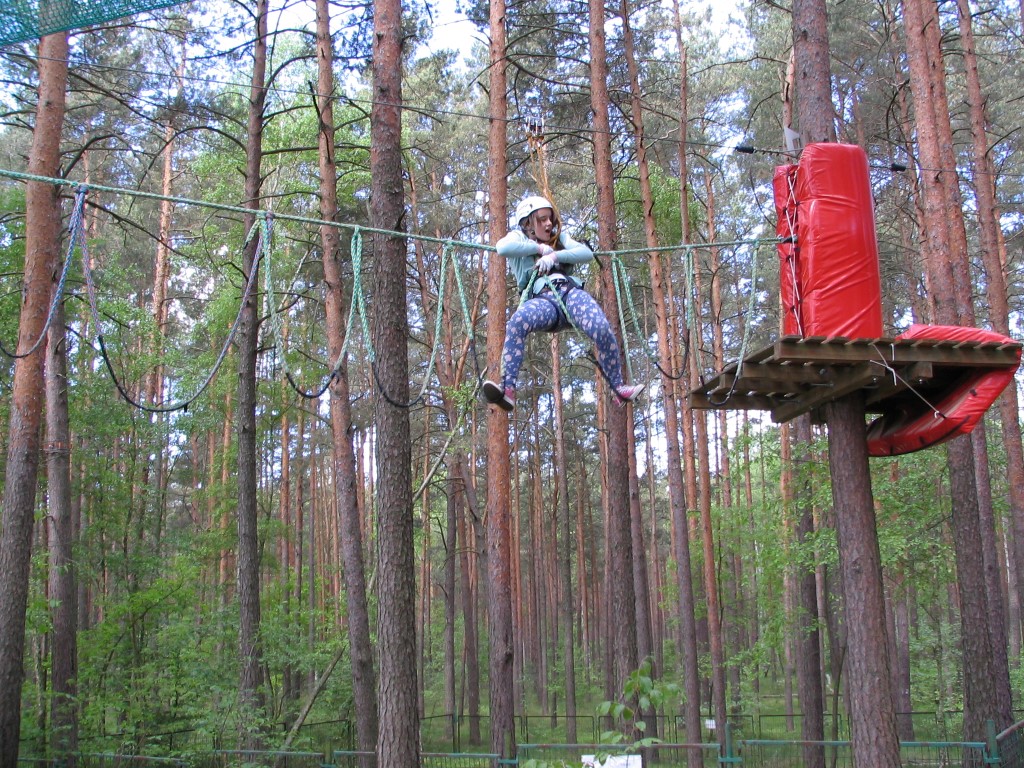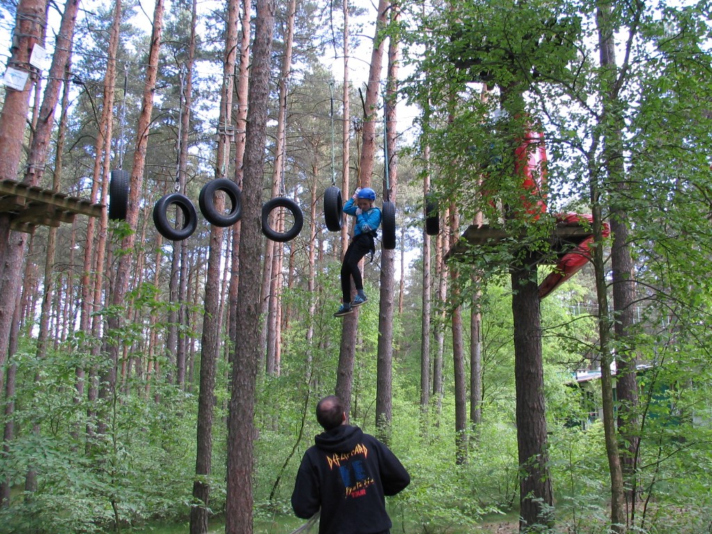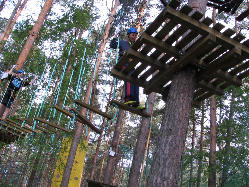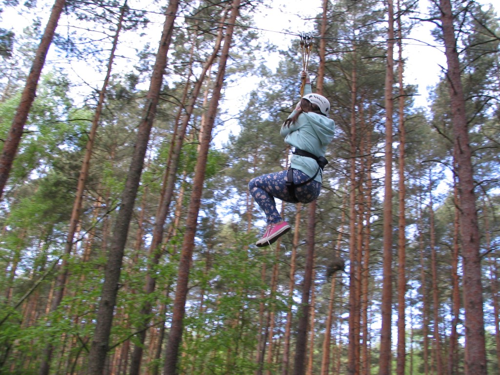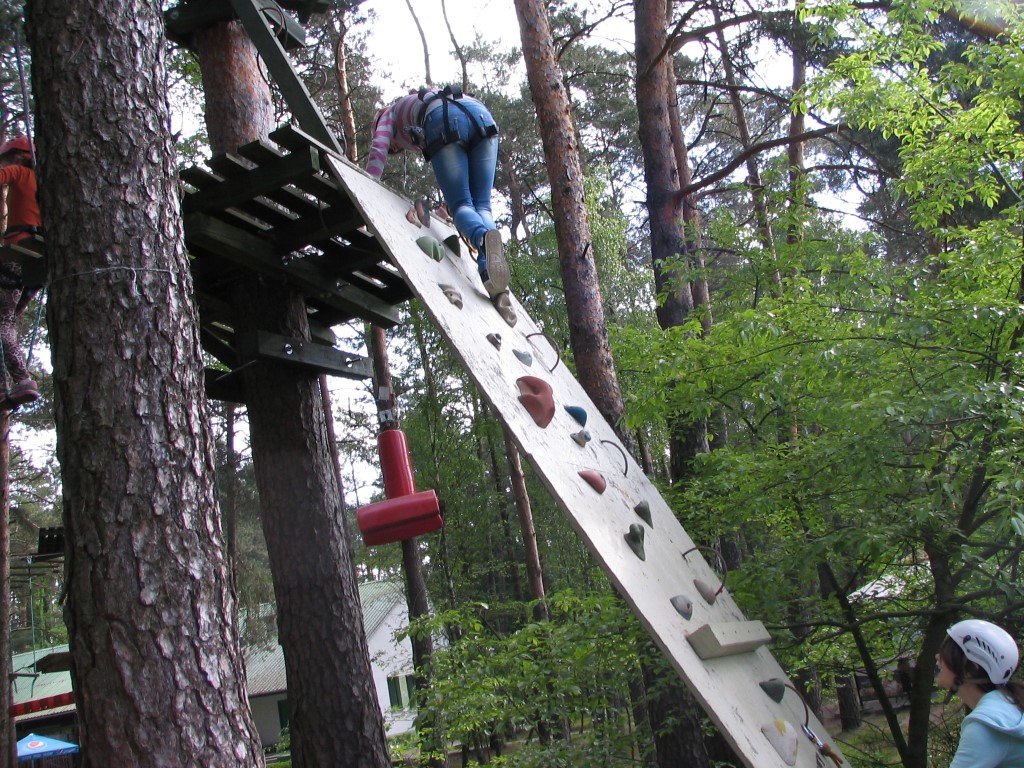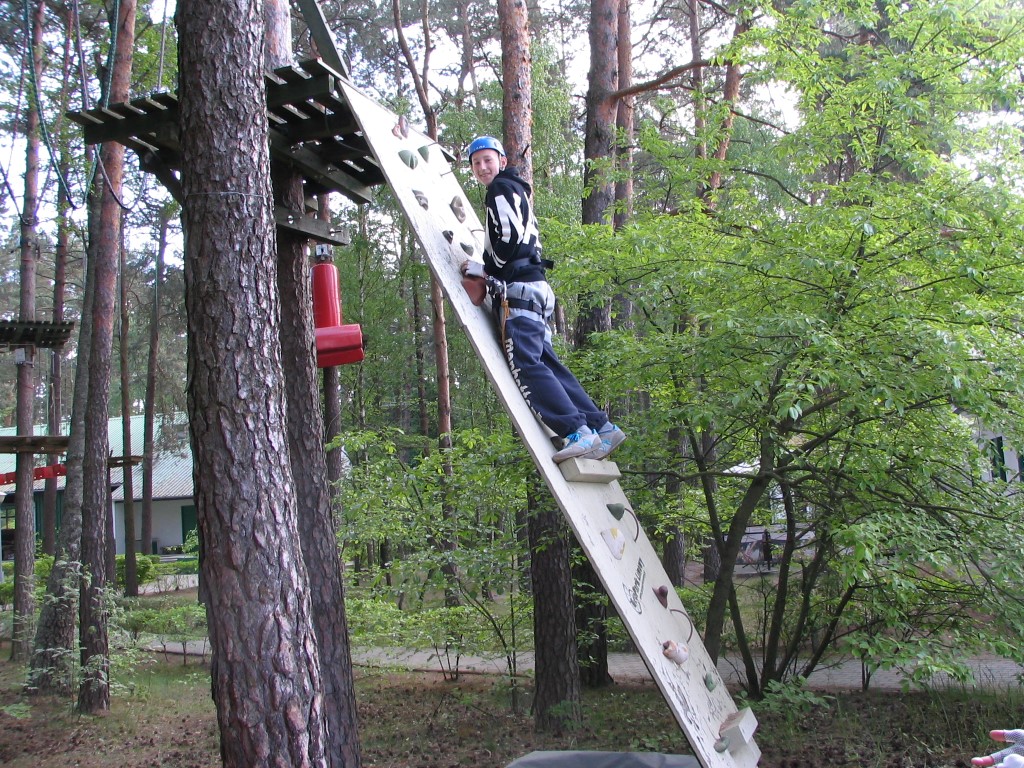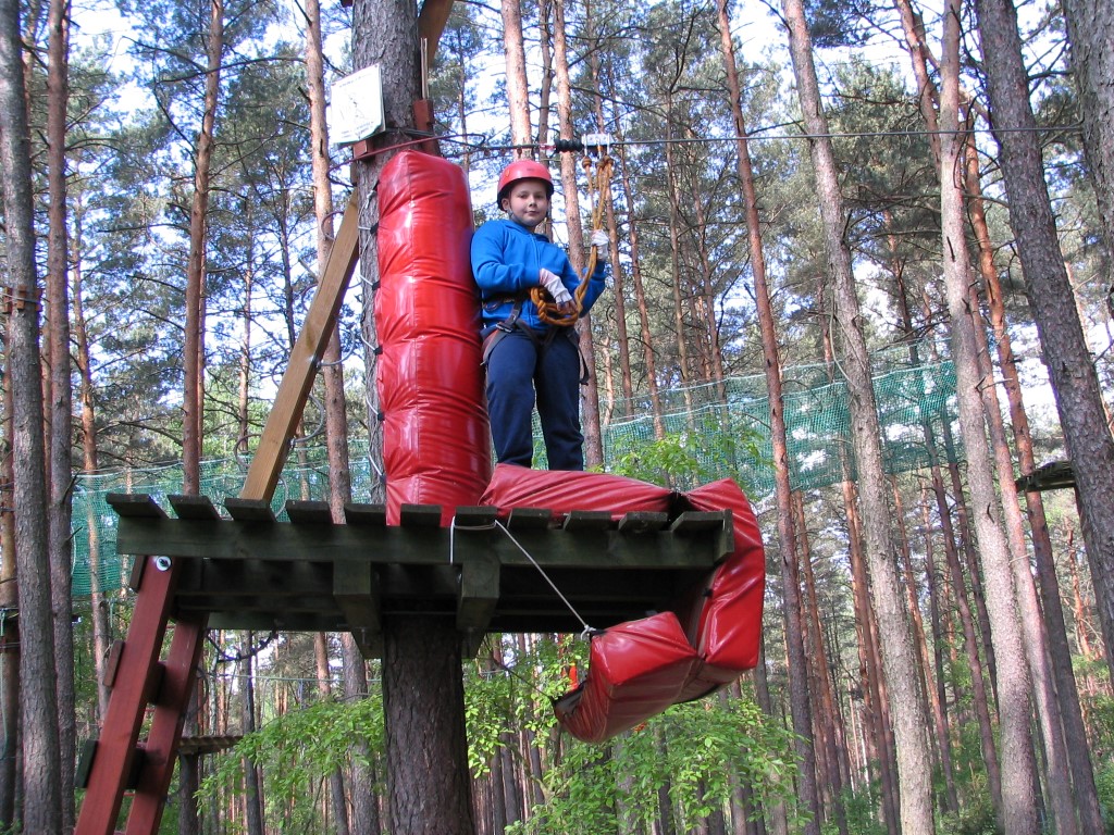 Niedawno wybraliśmy się na wycieczkę do Parku Linowego koło Piły. W tej wyprawie uczestniczyli prawie wszyscy uczniowie klas starszych ( IV-VI ). Celem tej wycieczki było spędzenie na łonie natury czasu, który dał nam możliwość nabrania pewności siebie, przełamania własnych słabości, poprawienia kondycji fizycznej, a wszystko to we wspaniałej scenerii sosnowego lasu. Uczestnicy mieli do dyspozycji trasę zieloną „Ścieżka pod reglami” , oraz trasę niebieską „Ścieżka nad reglami" . Czekały tam na nas różne atrakcje między innymi: trapezy, mosty birmańskie, kładki, ruchome belki, siatka, skok tarzana, mosty tyrolskie. Uczniowie przeszli podstawowe szkolenie alpinistyczne i ochoczo ruszyli przełamywać własne lęki. Dla większości z nich była to pierwsza tego typu atrakcja w życiu, ale jak sami stwierdzili „ z pewnością nie ostatnia”. Co niektórzy już po pokonaniu przeszkód czuli niedosyt i za niewielką dopłatą spróbowali swych sił jeszcze raz. Po trudach wspinaczki, zmęczeni, ale radośni i głodni poszliśmy na przygotowane dla nas ognisko, by uzupełnić pokłady energii. Kiełbasek było na tyle dużo, że nie byliśmy w stanie ich przejeść. Po posiłku wybraliśmy się nad jezioro „Płotki” na spacer po plaży. Dzieci nie mogąc doczekać się pełni lata moczyły swoje stopy w wodzie akwenu i podziwiały wspaniałe okazy ryb. Nie obyło się także bez gier i zabaw ruchowych na plaży. Chłopcy rozegrali mecz plażowej piłki nożnej, a dziewczęta turniej ringo. Zaliczyliśmy także wybudowany niedawno i oddany do użytku Plac Zabaw z prawdziwego zdarzenia. Opuściliśmy malownicze tereny w nadziei, że jeszcze kiedyś uda nam się spróbować swych sił w może jeszcze trudniejszych Parkach Linowych, których powstaje w naszym kraju coraz więcej.