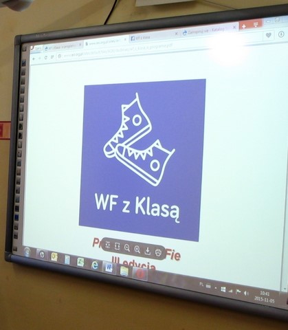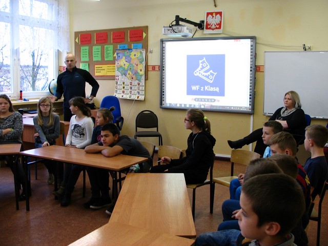 Dlaczego WF z klasą i co to takiego? Na to pytanie starałem się odpowiedzieć obecnym zapoznając ich z założeniami programu i omawiając krok po kroku nasze działania. Wykorzystaliśmy w tym celu prezentację programu i stronę internetową WF z klasą. Dzięki temu mogliśmy pokazać na tablicy multimedialnej najciekawsze propozycje i filmiki z poprzednich edycji. Dzieciom bardzo podobały się propozycje zabaw ich rówieśników, a także filmik na temat zdrowego stylu życia pt. „Jak działa zdrowy człowiek” https://www.youtube.com/watch?v=juEAccZaoJ0&feature=youtu.be .