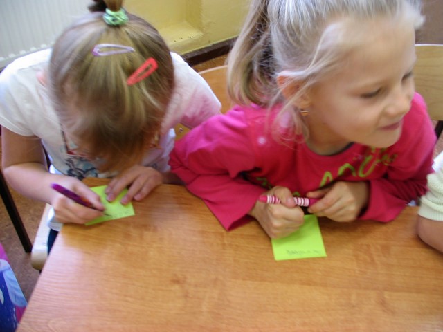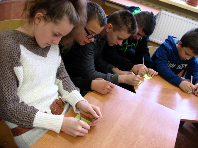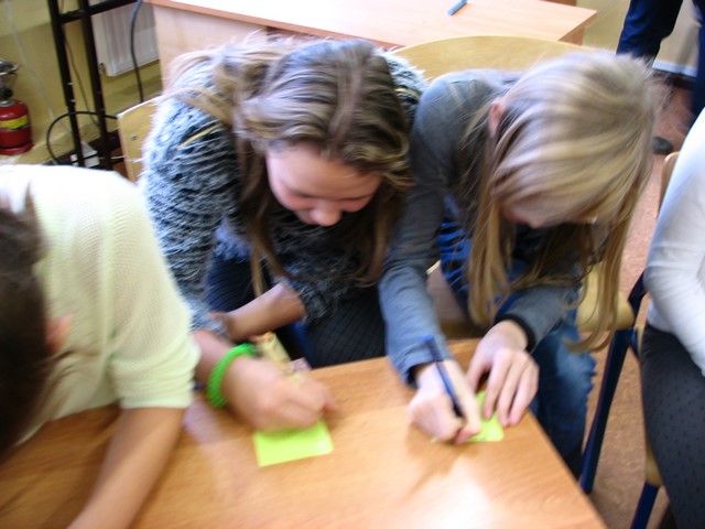 Przedstawiliśmy do wyboru zadania w ciągu roku. W wyniku dyskusji wybraliśmy do realizacji w I semestrze zadanie - RUCH NA LEKCJACH I AKTYWNE PRZERWY oraz w II semestrze zadanie – ROZRUSZAJ RODZICÓW. I żeby nie być gołosłownym już podczas pierwszego spotkania przeprowadziliśmy ćwiczenia śródlekcyjne przy otwartych oknach dla lepszego dotlenienia naszych komórek mózgowych. Podczas dyskusji uczniowie stwierdzili, że na lekcjach wychowania fizycznego realizujemy sporo różnych dyscyplin sportowych i że bardzo lubią zabawy ożywiające. Jakie są natomiast ich potrzeby w zakresie aktywności ruchowej ? W tym celu sekretarz rozdała karteczki, a uczniowie wyrazili swoje opinie pisemnie. Z przyklejonych na tablicy karteczek wyniknęły następujące postulaty:
