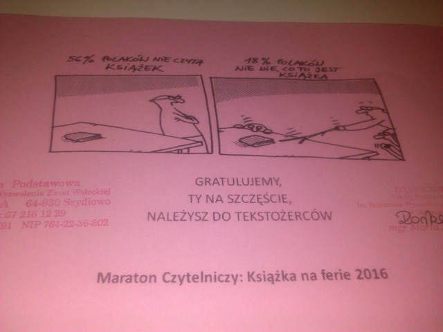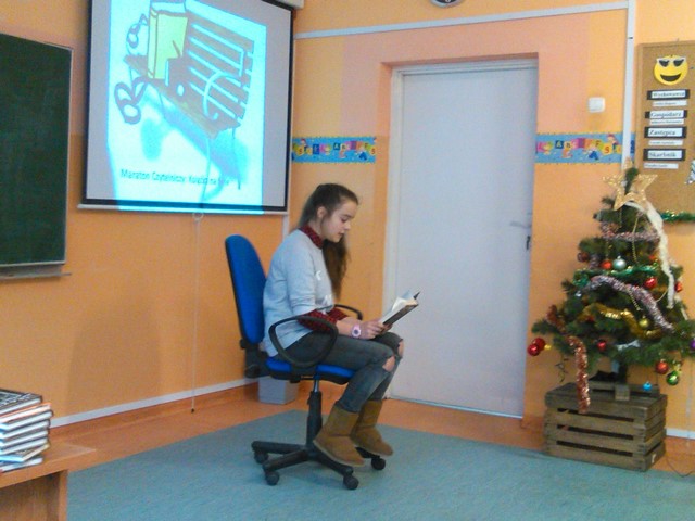 Na linii startowej maratonu stanęli wytrawni Tekstożercy. Zawodnicy prezentowali streszczenia ulubionych książek, następnie aktorsko odczytywali wybrany przez siebie fragment utworu. Audytorium słuchało i chłonęło literackie smaczki. Deserem okazała się mistrzowska interpretacja fragmentu Akademii Pana Kleksa w wykonaniu Pani Dyrektor, Marty Rorbach.