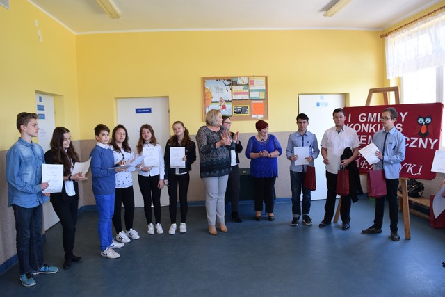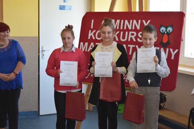 Po finale, uczestnicy konkursu zostali poczęstowani napojem i ciastkiem, a następnie Pani Dyrektor Szkoły Podstawowej w Skrzatuszu – Marta Rorbach, wręczyła cenne nagrody zwycięzcom, które ufundował Nadnotecki Bank Spółdzielczy – Oddział Szydłowo, Centrum Upowszechniania Kultury w Szydłowie, Gdańskie Wydawnictwo Oświatowe oraz Szkoła Podstawowa im. Bohaterów Wyzwolenia Ziemi Wałeckiej w Skrzatuszu. Każdy uczestnik finału I Gminnego Konkursu Matematycznego „Mistrz Matematyki” otrzymał dyplom i drobne gadżety matematyczne. Na koniec Pani Dyrektor Marta Rorbach pogratulowała wszystkim uczestnikom i zaprosiła za rok na II Gminny Konkurs Matematyczny „Mistrz Matematyki”.