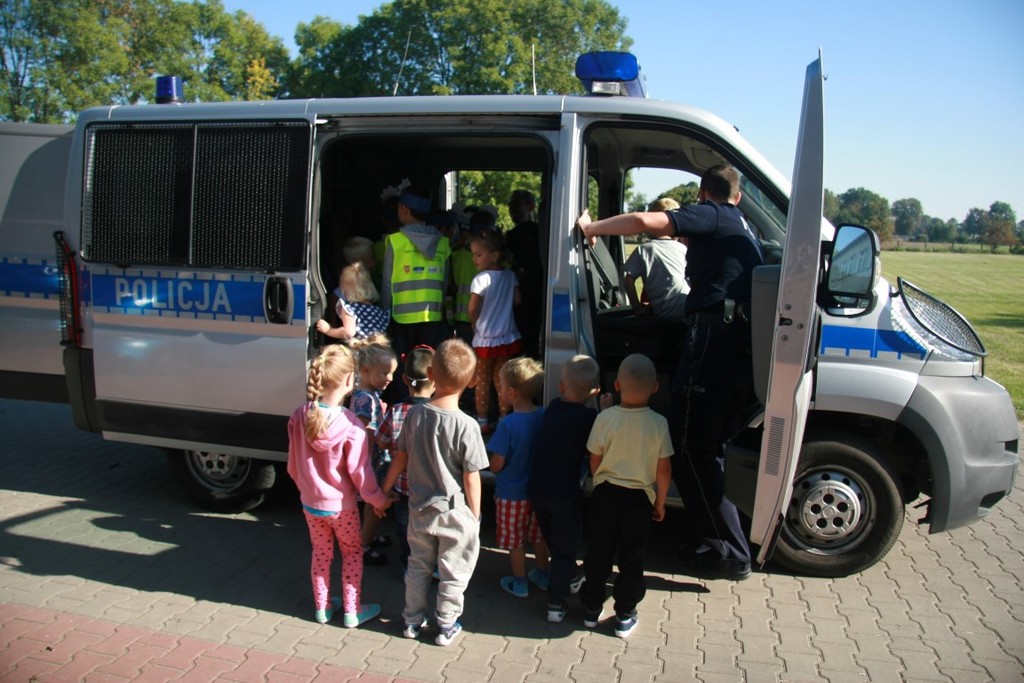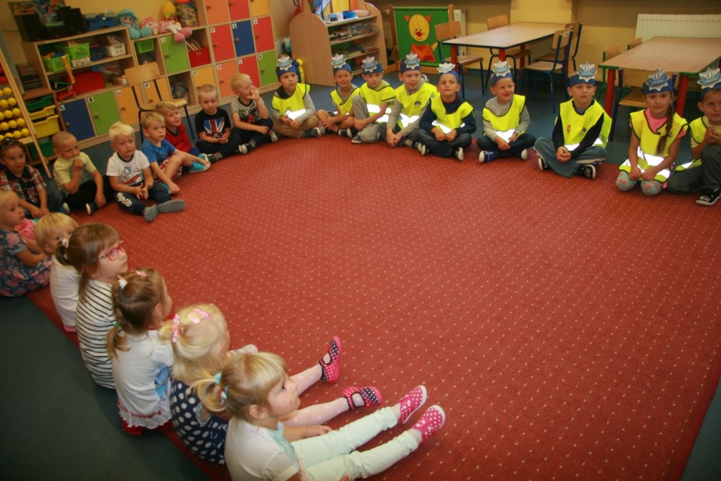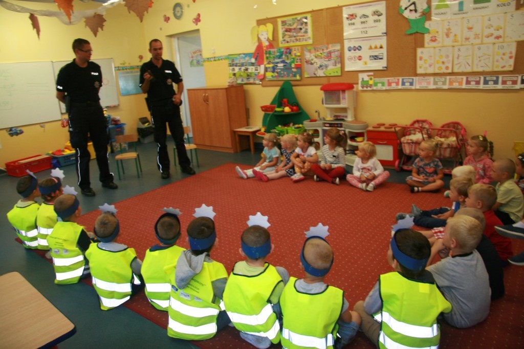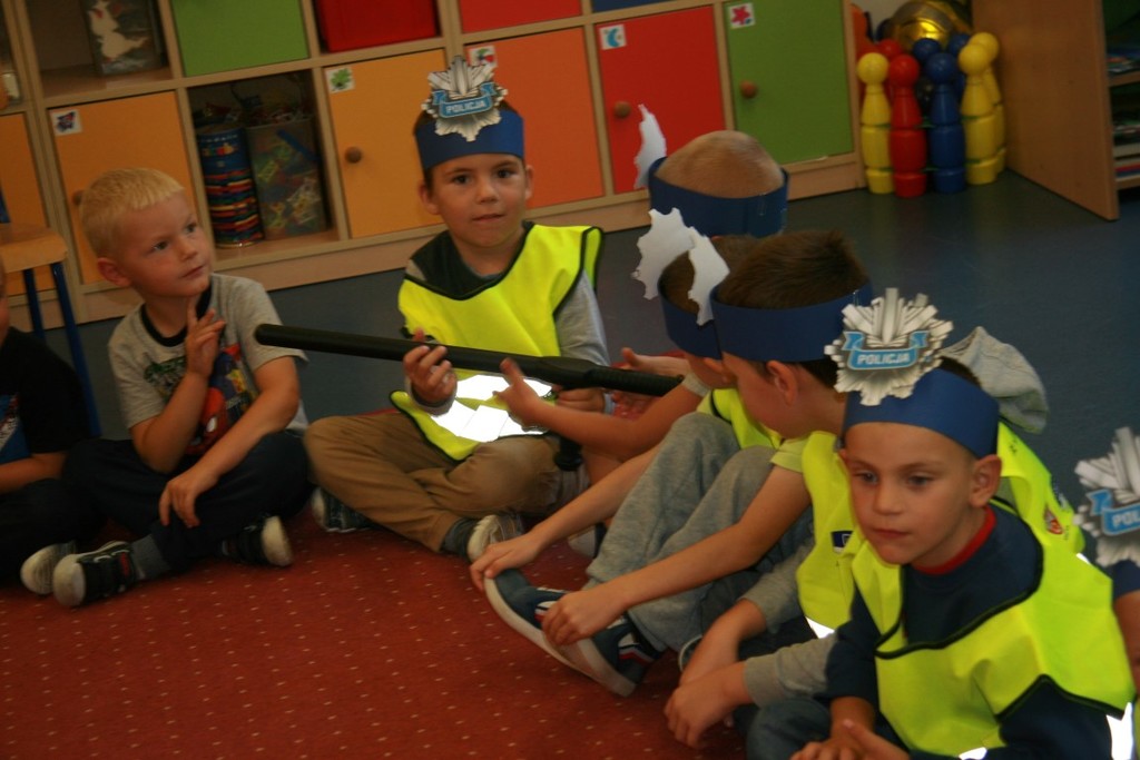 W dniu 16.09.2016r. nasze przedszkole odwiedzili funkcjonariusze Policji z Komendy Powiatowej w Pile. Panowie przeprowadzili prelekcję na temat bezpieczeństwa dzieci na drogach. Policjanci opowiadali przedszkolakom o swojej pracy, zaprezentowali również umundurowanie policjanta. Dużym zainteresowaniem cieszyły się kajdanki oraz inne akcesoria przyniesione przez funkcjonariuszy. Największą radość sprawiła dzieciom jazda radiowozem policyjnym na sygnale.