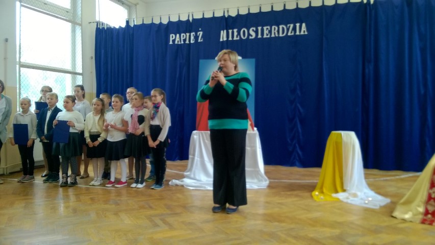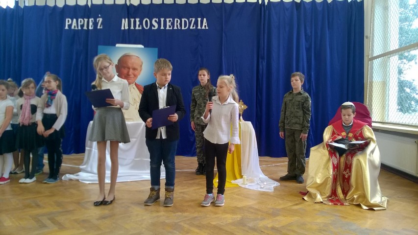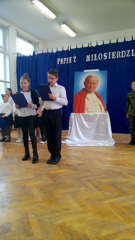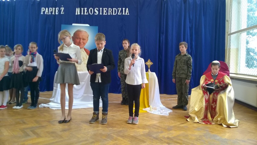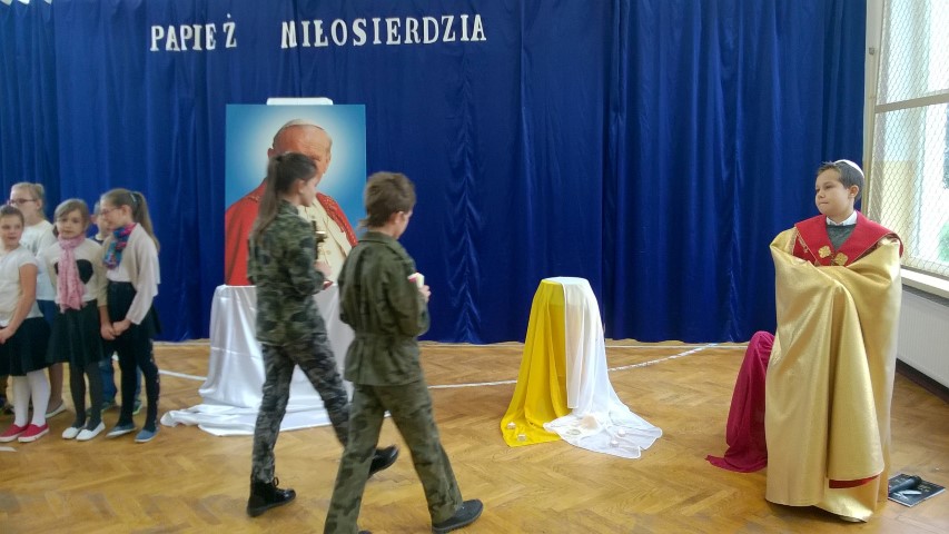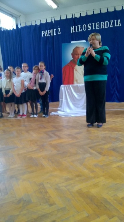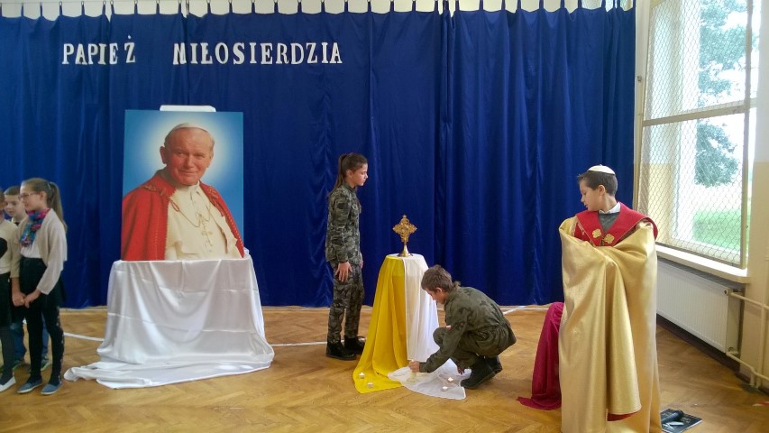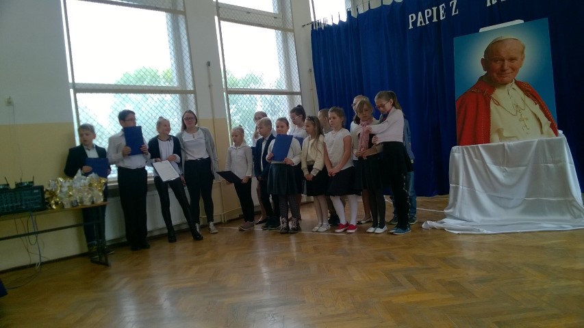 Dnia 18.10. odbył się w naszej szkole apel z okazji Dnia Papieskiego. Było to widowisko słowo- muzyczne zatytułowane " Wspomnienia o Janie Pawle II". Rozpoczęło się ono uroczystym wniesieniem relikwii Papieża. Uczniowie klas 5 i 6 przypominali nam fakty z życia Ojca Świętego, zespół muzyczny "Dzieci Maryi" wykonywał śpiew, a wszystko to było przeplatane nagraniami z przemówień Ojca Św. Jana Pawła II. Drugą część stanowiło rozdanie nagród dla dzieci biorących udział w konkursie różańcowym. Uwieńczeniem apelu było podejście każdej klasy od 0 do 6 i możliwość modlitwy przy relikwiach Jana Pawła II.