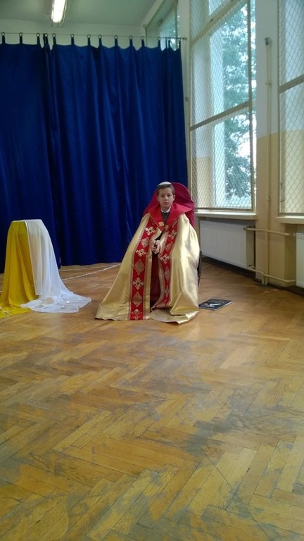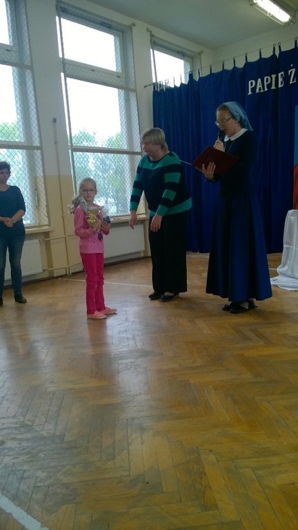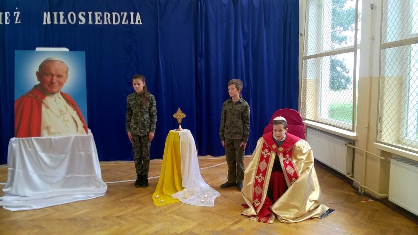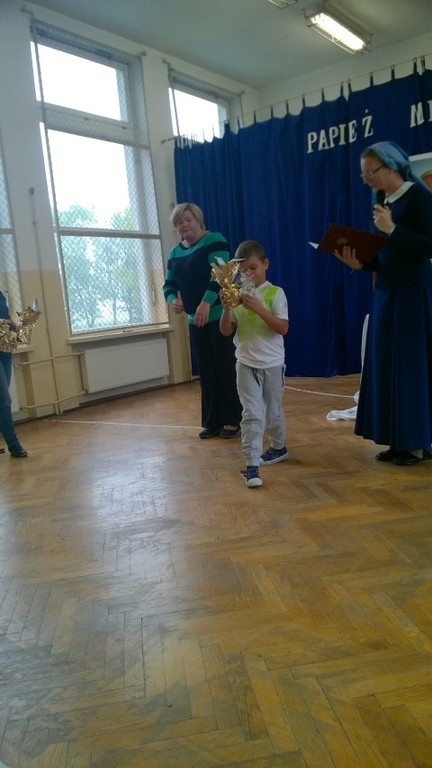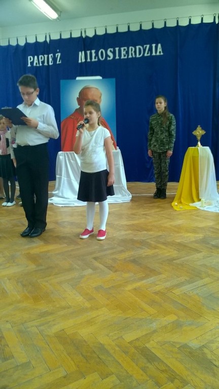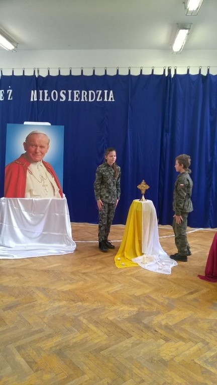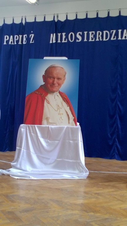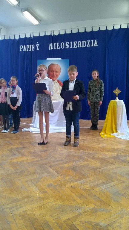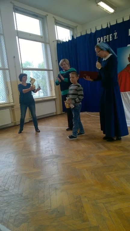 Dnia 18.10. odbył się w naszej szkole apel z okazji Dnia Papieskiego. Było to widowisko słowo- muzyczne zatytułowane " Wspomnienia o Janie Pawle II". Rozpoczęło się ono uroczystym wniesieniem relikwii Papieża. Uczniowie klas 5 i 6 przypominali nam fakty z życia Ojca Świętego, zespół muzyczny "Dzieci Maryi" wykonywał śpiew, a wszystko to było przeplatane nagraniami z przemówień Ojca Św. Jana Pawła II. Drugą część stanowiło rozdanie nagród dla dzieci biorących udział w konkursie różańcowym. Uwieńczeniem apelu było podejście każdej klasy od 0 do 6 i możliwość modlitwy przy relikwiach Jana Pawła II.