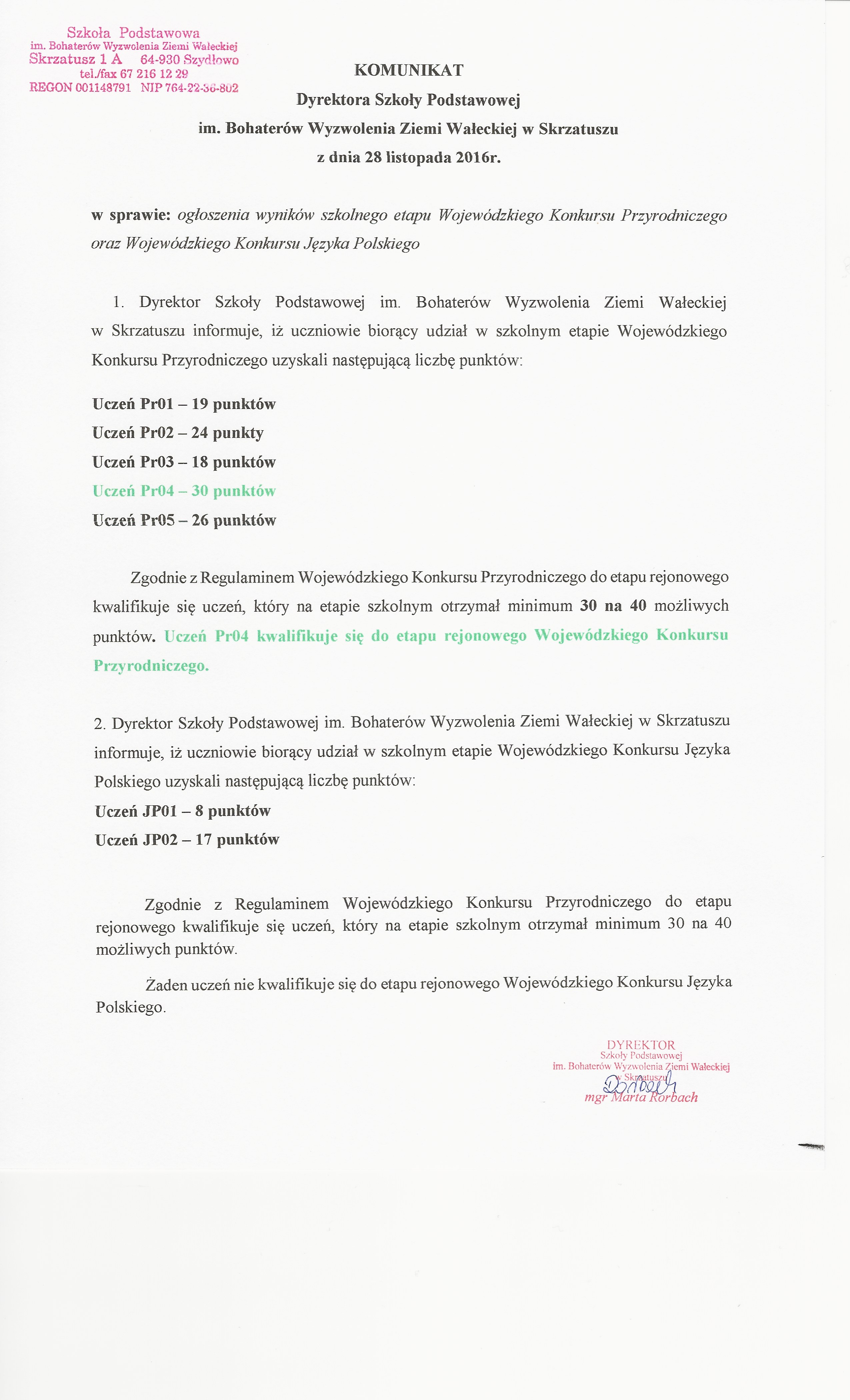 Wyniki szkolnych etapów konkursów kuratoryjnych przyroda i język polski.