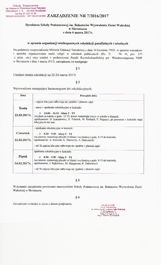 W załączniku Zarządzenie Dyrektora Szkoły Podstawowej w Skrzatuszu w sprawie organizacji wielkopostnych rekolekcji parafialnych i szkolnych KLIKNIJ