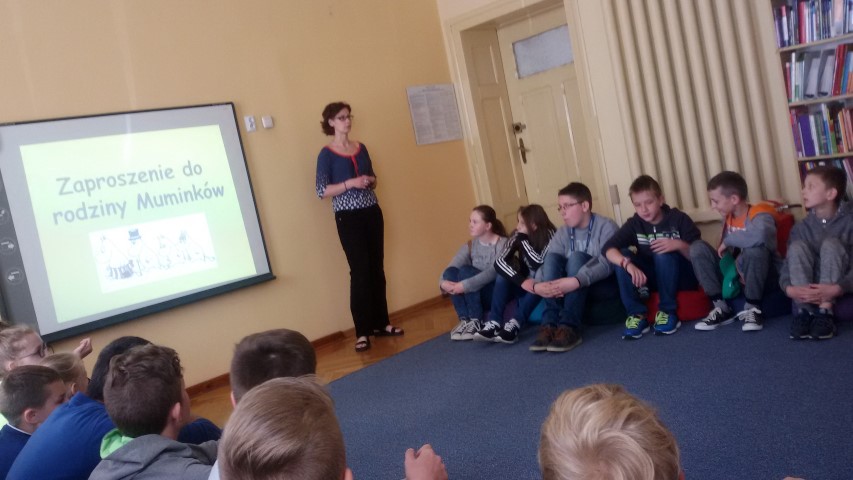 Uczniowie z klas 4-6 przyjechali do w Biblioteki Pedagogicznej w Pile. Tam wzięli udział w zajęciach czytelniczych pt. Zaproszenie do rodziny Muminków, które poprowadziła pani Monika Olejnik . W trakcie zajęć mieli możliwość sprawdzić swoją wiedzę w teście oraz w quizie z wykorzystanie tablicy interaktywnej. Na zakończenie uczniowie mieli możliwość zwiedzić pomieszczenia biblioteczne .