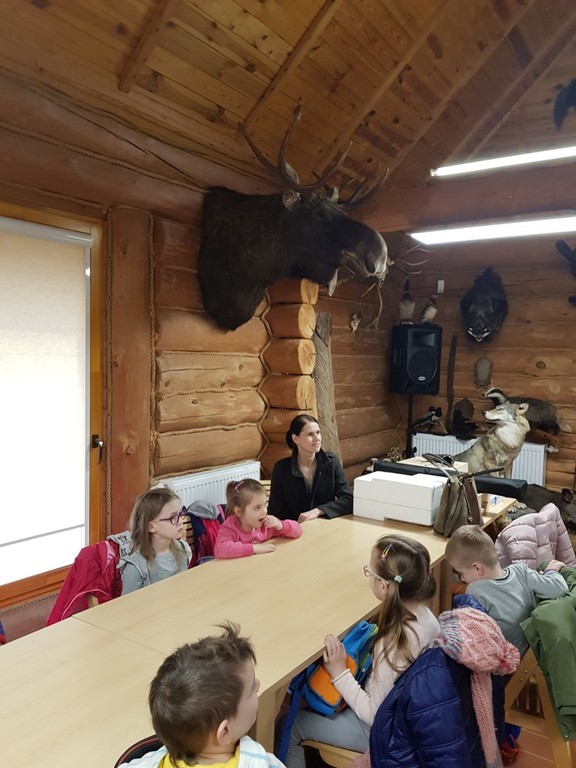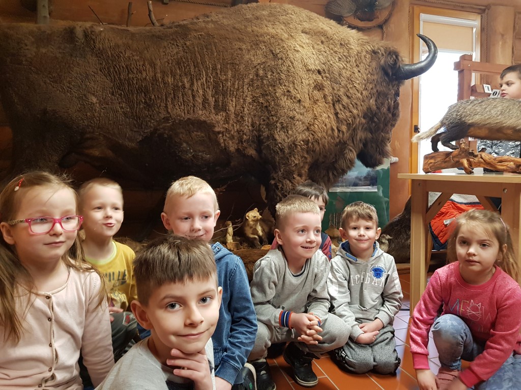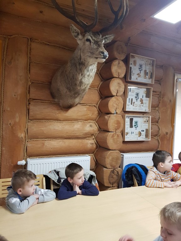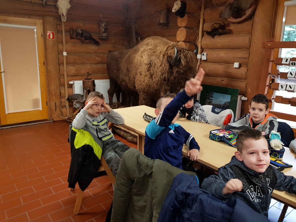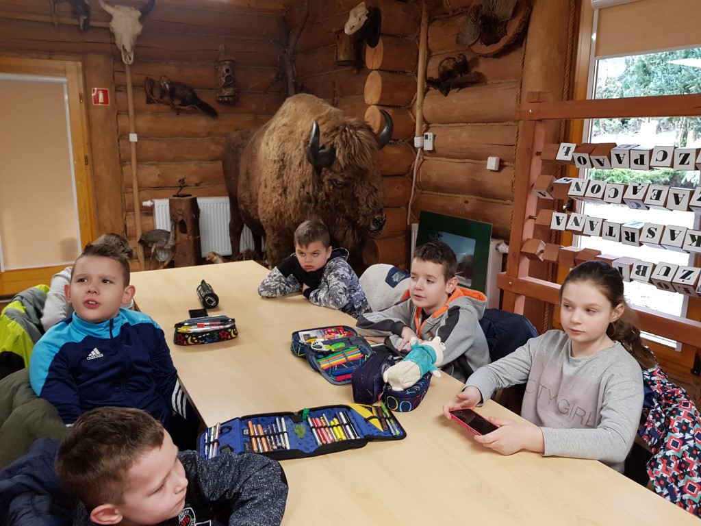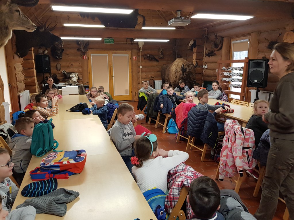 W wygodnym i przestronnym pawilonie dzieci miały okazję wysłuchać pani leśnik, która bardzo interesująco opowiadała nam o faunie i florze tego terenu. Prowadzone zajęcia urozmaiciły spreparowane okazy zwierząt. Podziwialiśmy zastygłe w bezruchu żubra, dzika, rysia, wilka, lisa, kunę, bobra, wiewiórkę. Uczniowie aktywnie pracowali również z kartami pracy. Po zajęciach przespacerowaliśmy się po ogrodzie botanicznym, który liczy ponad 120 przeróżnych gatunków roślin. Niestety, po długiej zimie był on jeszcze mało kolorowy. Ale przy następnej wizycie będziemy podziwiać go już kwitnący całą paletą barw! Pani leśnik zapowiedziała nam też spacer małego badacza po ścieżce przyrodniczo - leśnej, podczas którego zaopatrzeni w pomoce dydaktyczne (plecaczki wraz lupami, lornetkami i kompasami) będziemy poznawać piękną przyrodę. Wycieczka ta bardzo nas ucieszyła i czekamy na następną za miesiąc!
