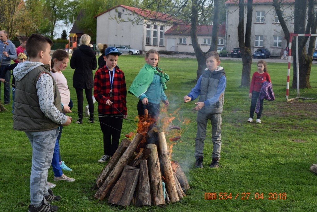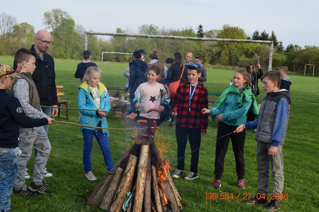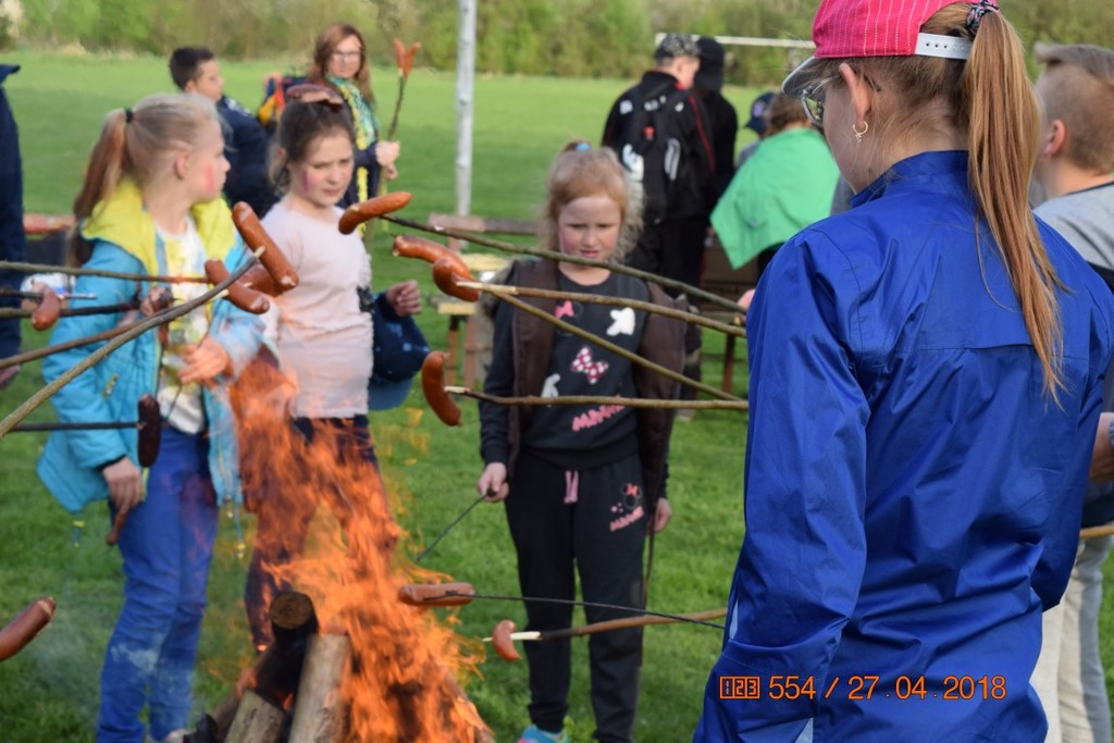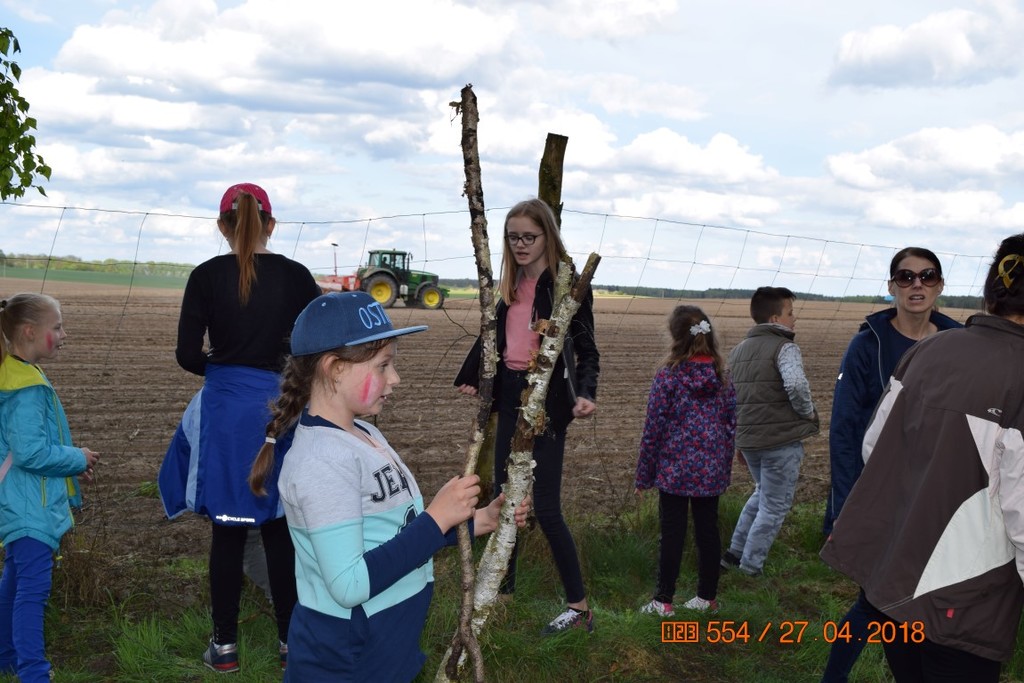 „Dzień Ziemi” był okazją do uczczenia tego wydarzenia rodzinnie pośród pól i lasów pięknego krajobrazu Skrzatuskiego. Udało nam się połączyć 2 w 1, a mianowicie 100 – lecie Odzyskania Niepodległości z obcowaniem na łonie przyrody. PIĘKNO PRZYRODY W NIEPODLEGŁEJ WIELKOPOLSCE to dla nas okazja, żeby ten czas spędzić aktywnie. A jak aktywność to na świeżym powietrzu. I tak oto zrodził się pomysł PODCHODÓW 😀. Zadaniem uczniów zarówno tych młodszych z I-III jak i tych starszych z IV-VII było odnalezienie zadań skrzętnie pochowanych na trasie. Żeby tego dokonać należało odczytać azymut na kompasie, czyli kierunek w jakim uciekała grupa i rozwiązać zadania. W tym roku zadania były nie tylko przyrodnicze, ale i historyczne. Trasa liczyła kilka kilometrów, ale każdy dzielnie maszerował. Dla niektórych były to pierwsze podchody w życiu. Atrakcją dla dzieci był podziemny bunkier, w którym mogły się schować. Po powrocie do szkoły zasiedliśmy wspólnie przy ognisku, piekąc kiełbaski i prowadząc wesołe rozmowy. Młodzież rzucała granatami do celu, ale na szczęście obyło się bez ofiar ( nadmienię, że były to atrapy 🙂 ) Miło jest spędzić razem z dziećmi, rodzicami i nauczycielami czas w niecodziennej formie z dala od ławek szkolnych.