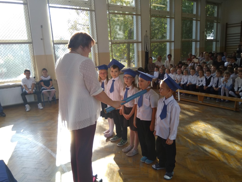 Po otrzymaniu gromkich braw nadszedł najważniejszy moment uroczystości. Pierwszaki zgodnym chórem złożyły ślubowanie. Następnie pani Dyrektor pasowała każdego z nich na ucznia Szkoły Podstawowej. Na koniec uroczystości Pierwszaki otrzymały pamiątkowe dyplomy oraz upominki przygotowane przez Radę Rodziców, starszych kolegów z klasy II oraz rodziców.