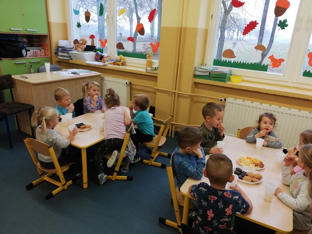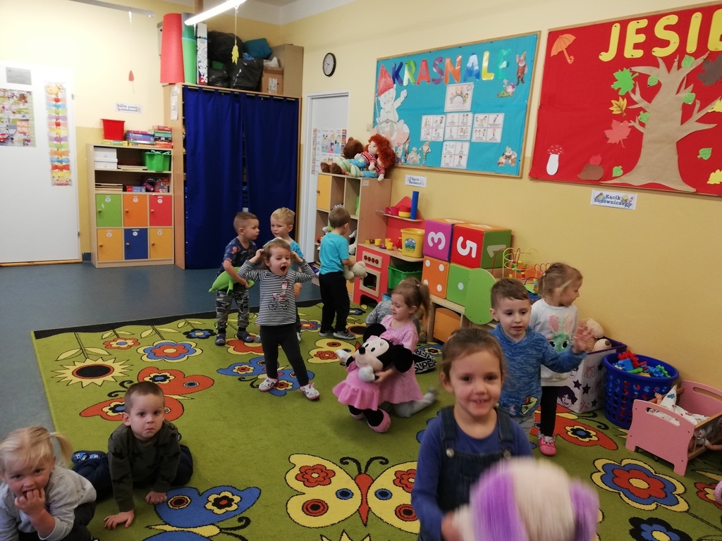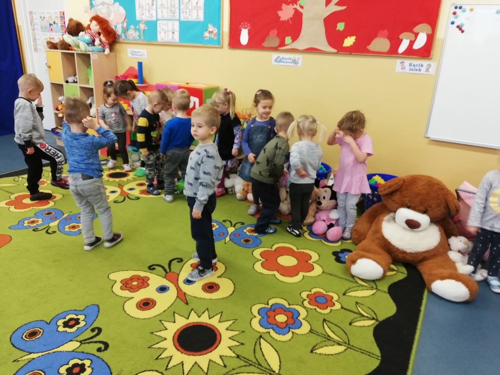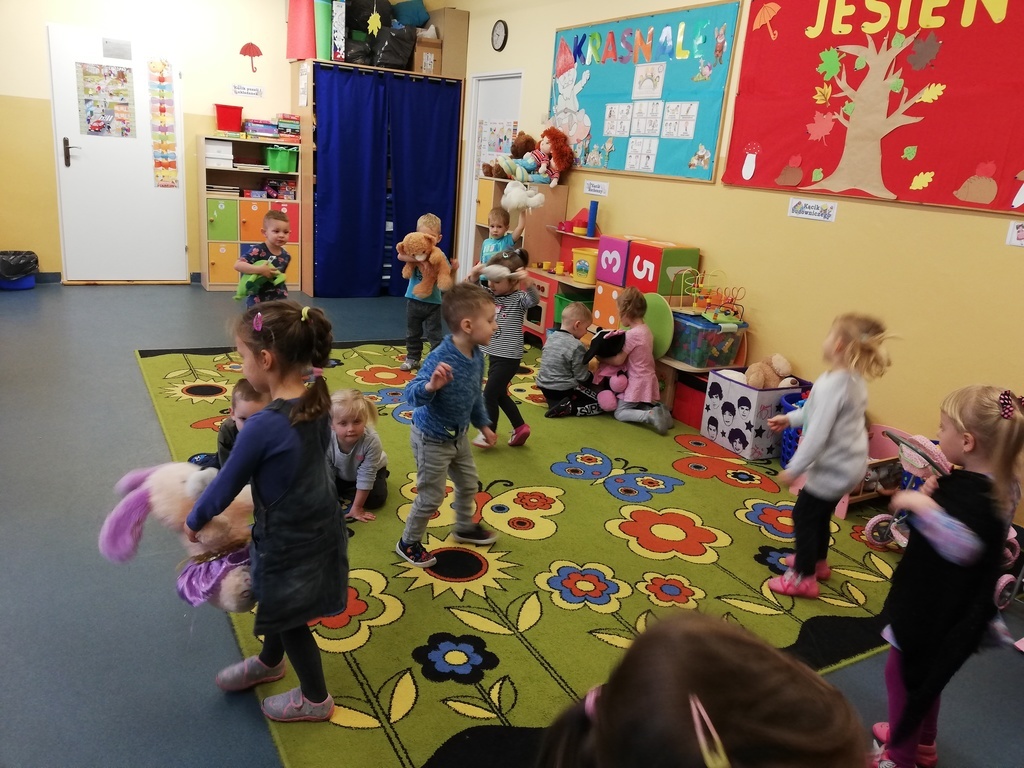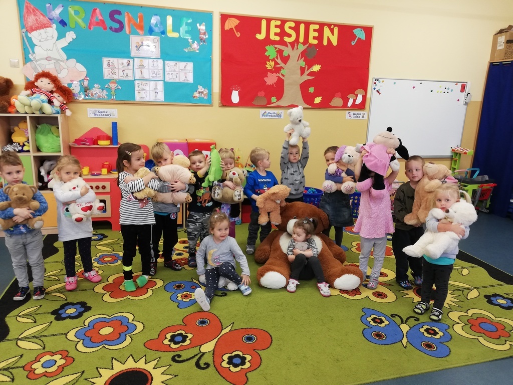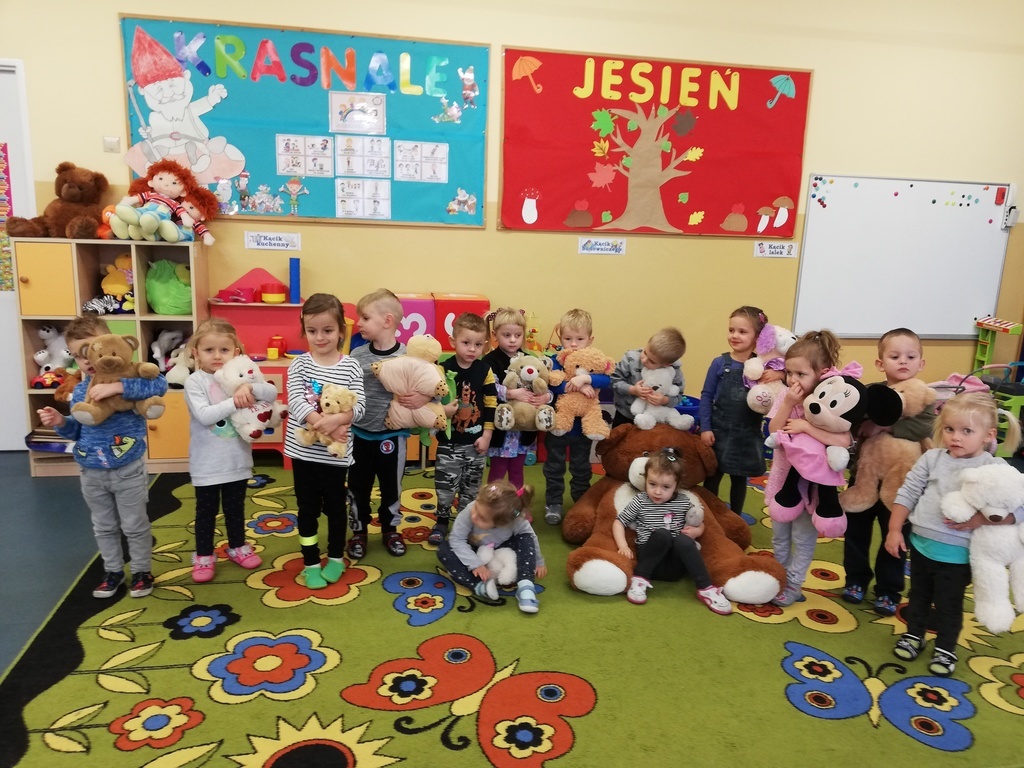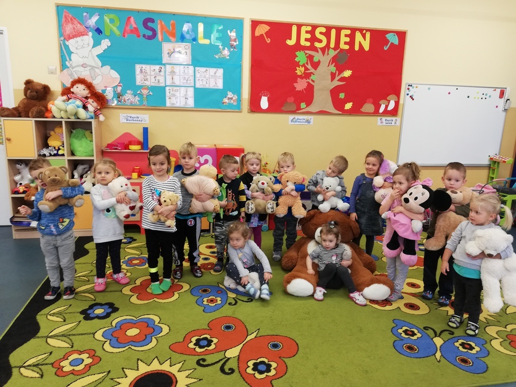 W dniu 23 listopada nasze przedszkolaki z grupy Krasnali obchodziły święto Dnia Pluszowego Misia. Tego dnia każde dziecko przyszło do przedszkola ze swoim ulubionym misiem. Dzień ten rozpoczął się od zapoznania dzieci z historią pluszowego misia, następnie wspólnie ze swoimi maskotkami wesoło bawiły się przy muzyce. Kolejnym punktem spotkania było ułożenie swoich misiów od największego do najmniejszego, zatańczenie i zaśpiewanie piosenki „Niedźwiadek”. „Krasnale” w tym dniu otrzymały ciasteczko w kształcie misia oraz Dyplom Przyjaciela Misia. Po tańcach i zabawach na dzieci czekał słodki poczęstunek.