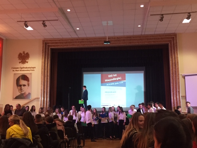 W czwartek 29 listopada klasa 8 wraz z wychowawcą, panią Anną Posadzińską, miała okazję uczestniczyć w uroczystości zorganizowanej przez I Liceum Ogólnokształcące im. Marii Skłodowskiej – Curie w Pile, która była podsumowaniem wydarzeń szkolnych związanych z 100 rocznicą odzyskania niepodległości.