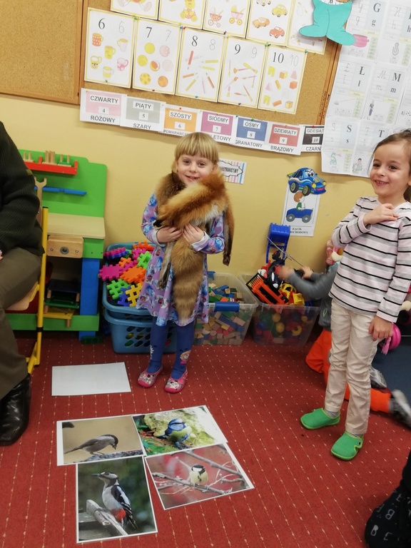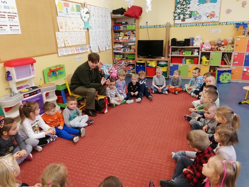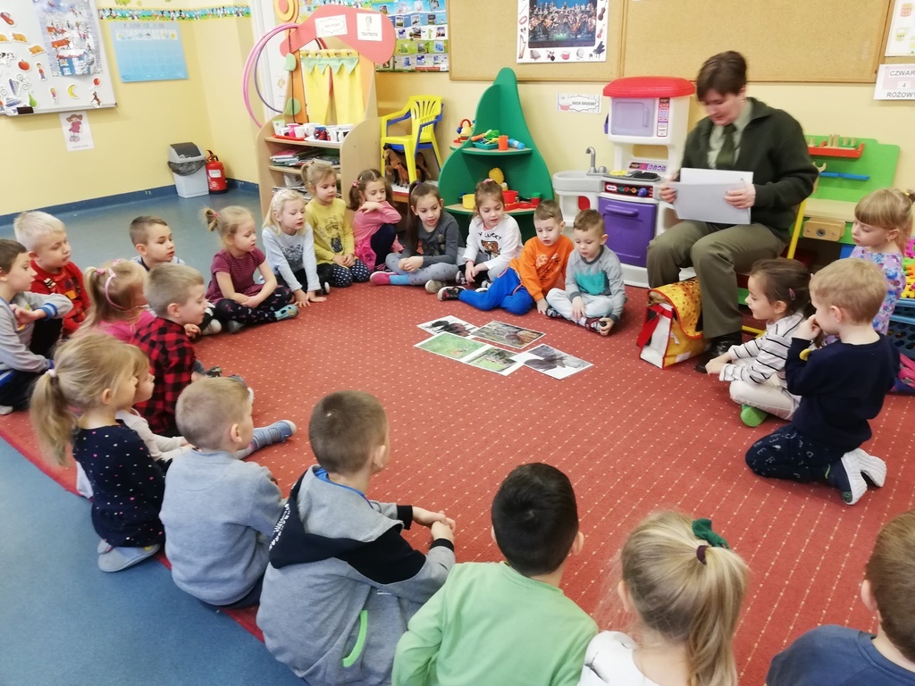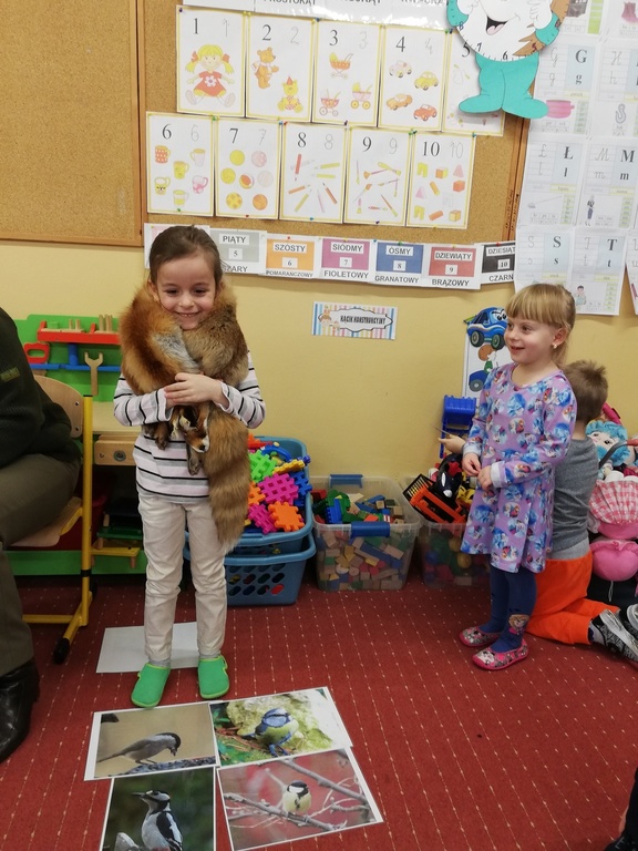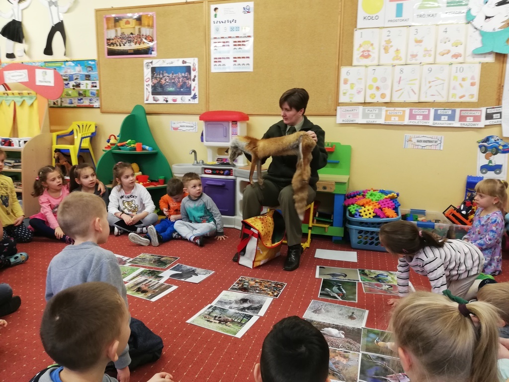 Nasz gość przypomniał o pracy leśnika, wyjaśnił różnice pomiędzy leśnikiem, a kłusownikiem. Tematem spotkania było: Dokarmianie zwierząt w lesie w czasie zimy. Dzieci miały okazję zobaczyć i dotknąć prawdziwe futro z lisa, bobra oraz jenota. Dzieci poznały zasady dokarmiania zwierząt oraz dowiedziały się, które ze zwierząt są mięsożerne, a które roślinożerne.