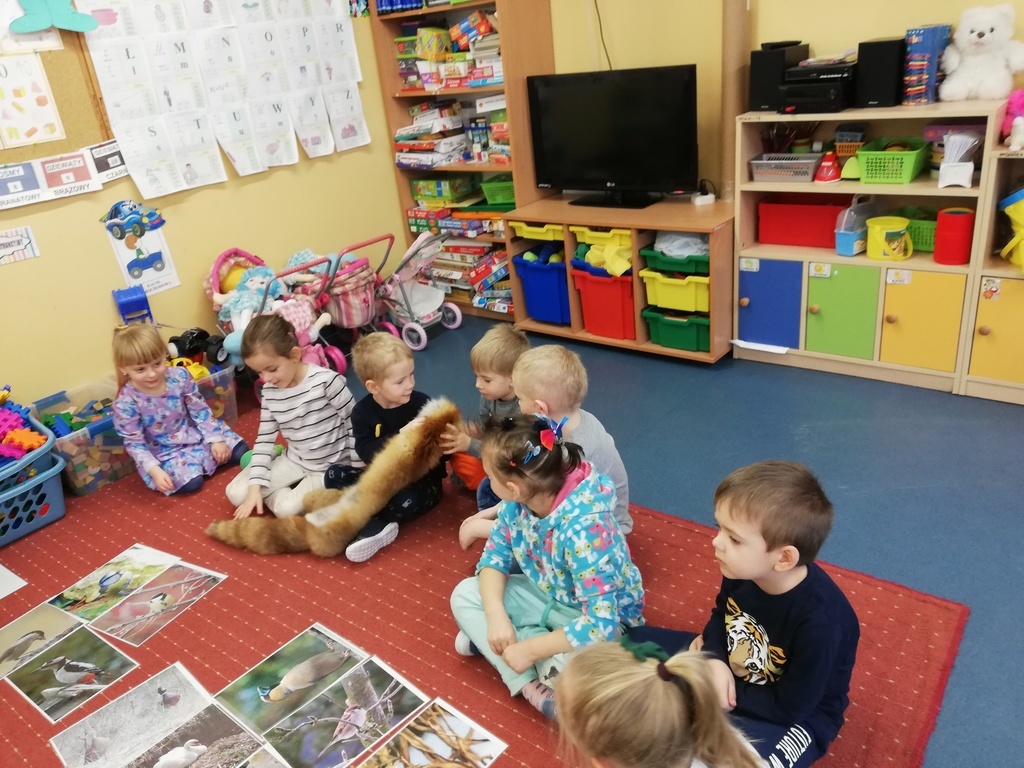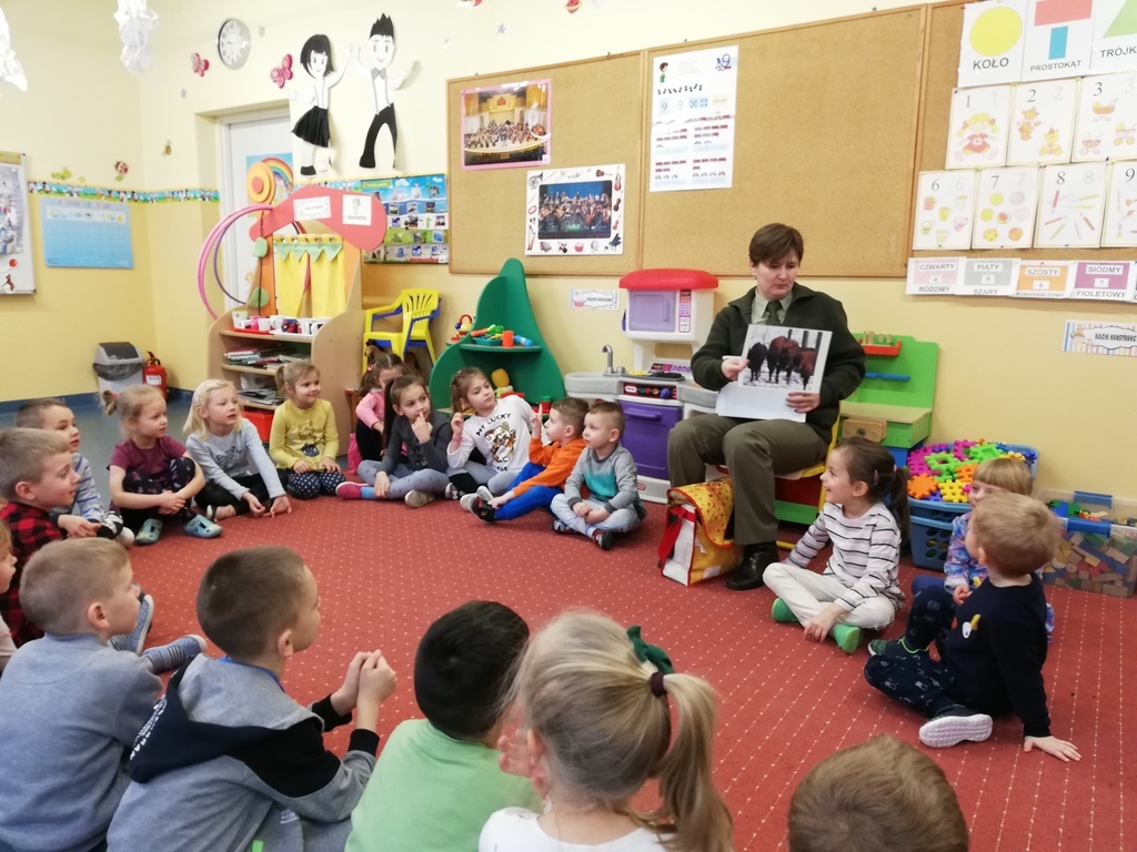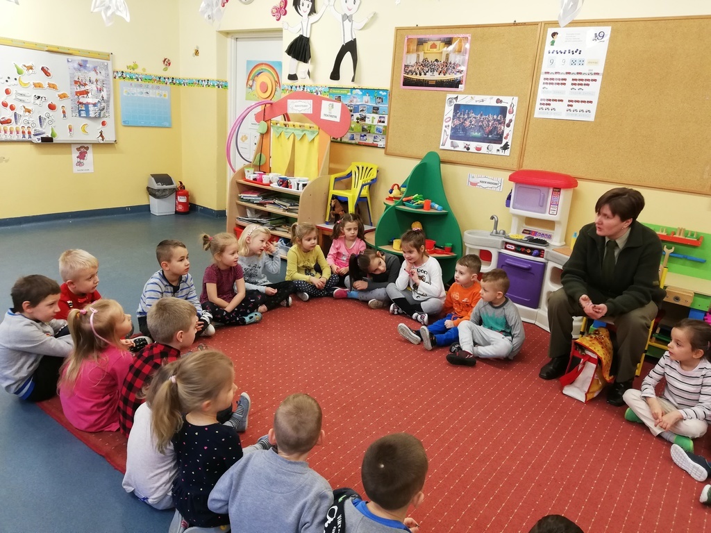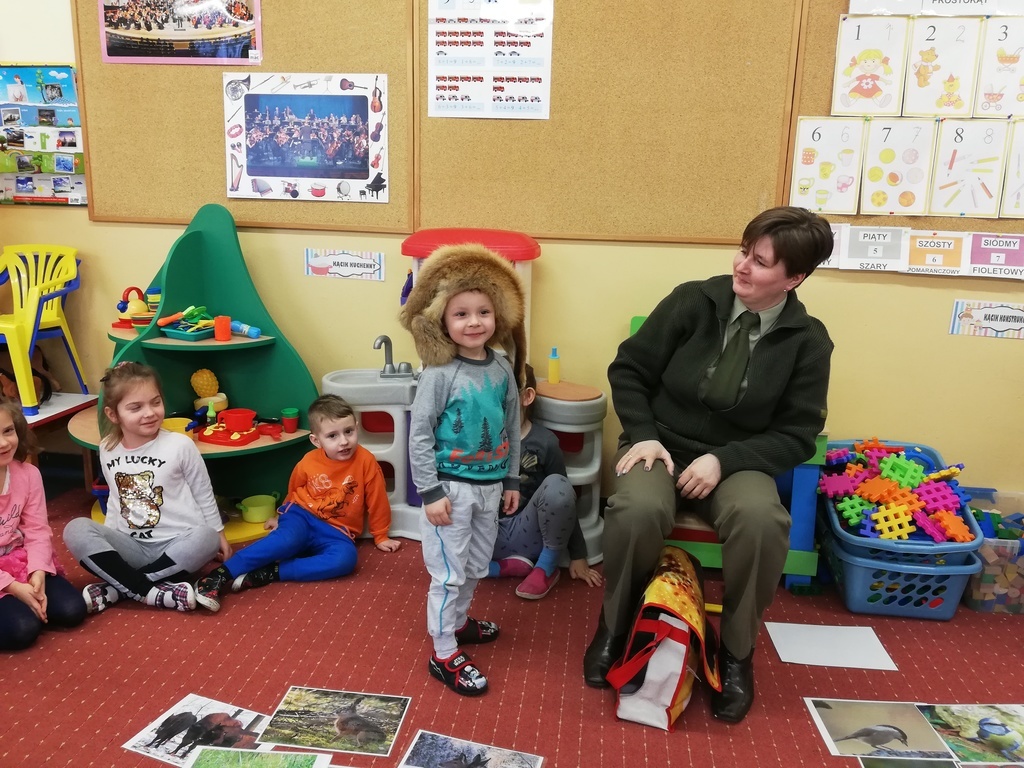 Nasz gość przypomniał o pracy leśnika, wyjaśnił różnice pomiędzy leśnikiem, a kłusownikiem. Tematem spotkania było: Dokarmianie zwierząt w lesie w czasie zimy. Dzieci miały okazję zobaczyć i dotknąć prawdziwe futro z lisa, bobra oraz jenota. Dzieci poznały zasady dokarmiania zwierząt oraz dowiedziały się, które ze zwierząt są mięsożerne, a które roślinożerne.