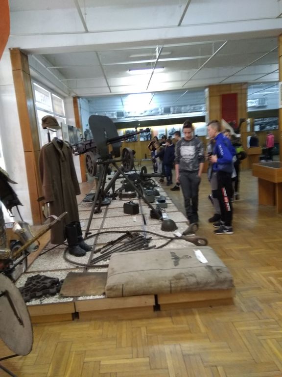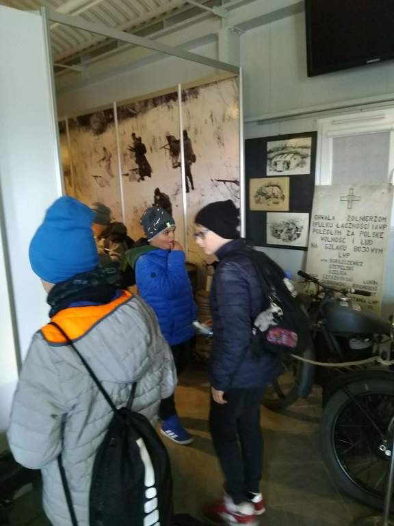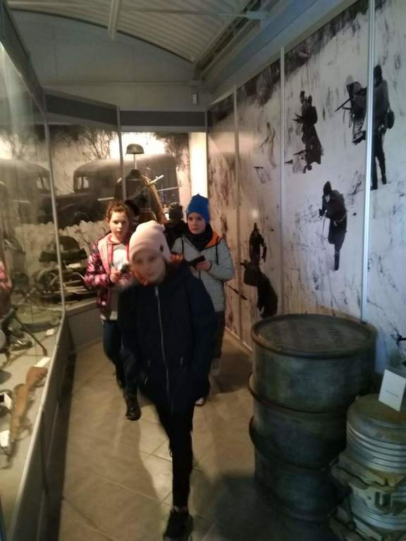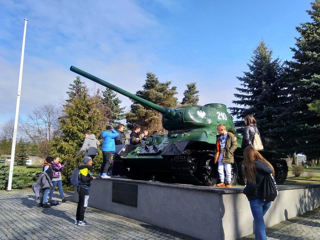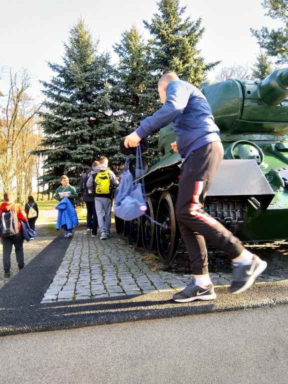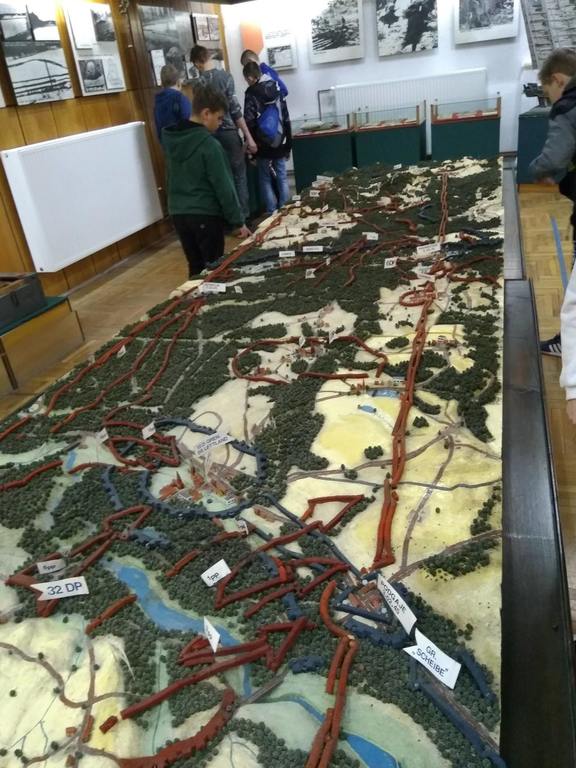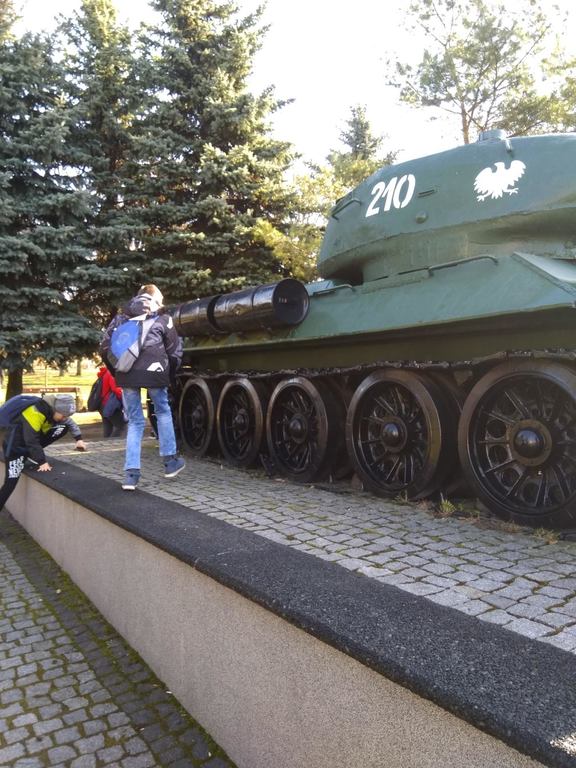 Poznawanie historii walk o Wał Pomorski rozpoczęliśmy od zwiedzenia muzeum w Mirosławcu. Obejrzeliśmy w nim pamiątki związane z wyzwalaniem Wału Pomorskiego oraz zakończeniem II Wojny Światowej. Wśród eksponatów naszą uwagę przykuła makieta imitująca działania na obszarze umocnień Wału Pomorskiego. W tym miejscu bardzo spodobała się również nam ekspozycja plenerowa – działa artyleryjskie, czołg T-34 oraz samolot Su-22.