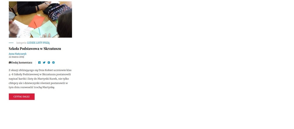 W przededniu Dnia Kobiet uczniowie naszej szkoły postanowili sprawić pewnej malej kobietce miłą niespodziankę. Uczniowie klas 4-8 wzięli udział w ogólnopolskiej akcji pisania listów i kartek do nieuleczalnie chorych dzieci - MARZYCIELSKA POCZTA. Wybraliśmy 9 letnią Martynkę Kurek - dziewczynkę chora na mukowiscydozę. Uczniowie bardzo chętnie przynieśli kartki i złożyli dziewczynce życzenia z okazji Dnia Kobiet oraz wytrwałości w chorobie.
