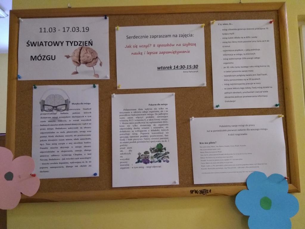 W dniach 11-17 marca 2019 roku na całym świecie obchodzony był TYDZIEŃ MÓZGU. Uczniowie klas 4-8 tutejszej podstawówki też włączyli się w te obchody, w sposób trochę nietypowy. Postanowiliśmy sprawić, aby nasz mózg w pełni pobudził się do działania po zimowej przerwie :). Uczniowie każdego dnia dostawali do rozwiązania łamigłówki matematyczne, za które otrzymywali oceny a dzięki pracy nad którymi nasz mózg zdecydowanie musiał popracować W ramach obchodów przeprowadzone zostały również zajęcia "Jak szybko i skutecznie uczyć się", a na zakończenie tygodnia uczniowie chętni recytowali z pamięci, 20 kolejnych cyfr liczby Pi. O mózg uczniów w tym tygodniu zadbała