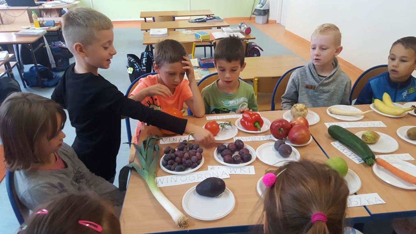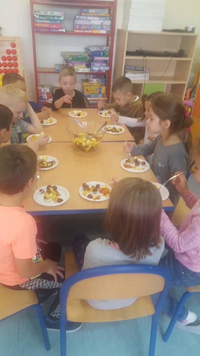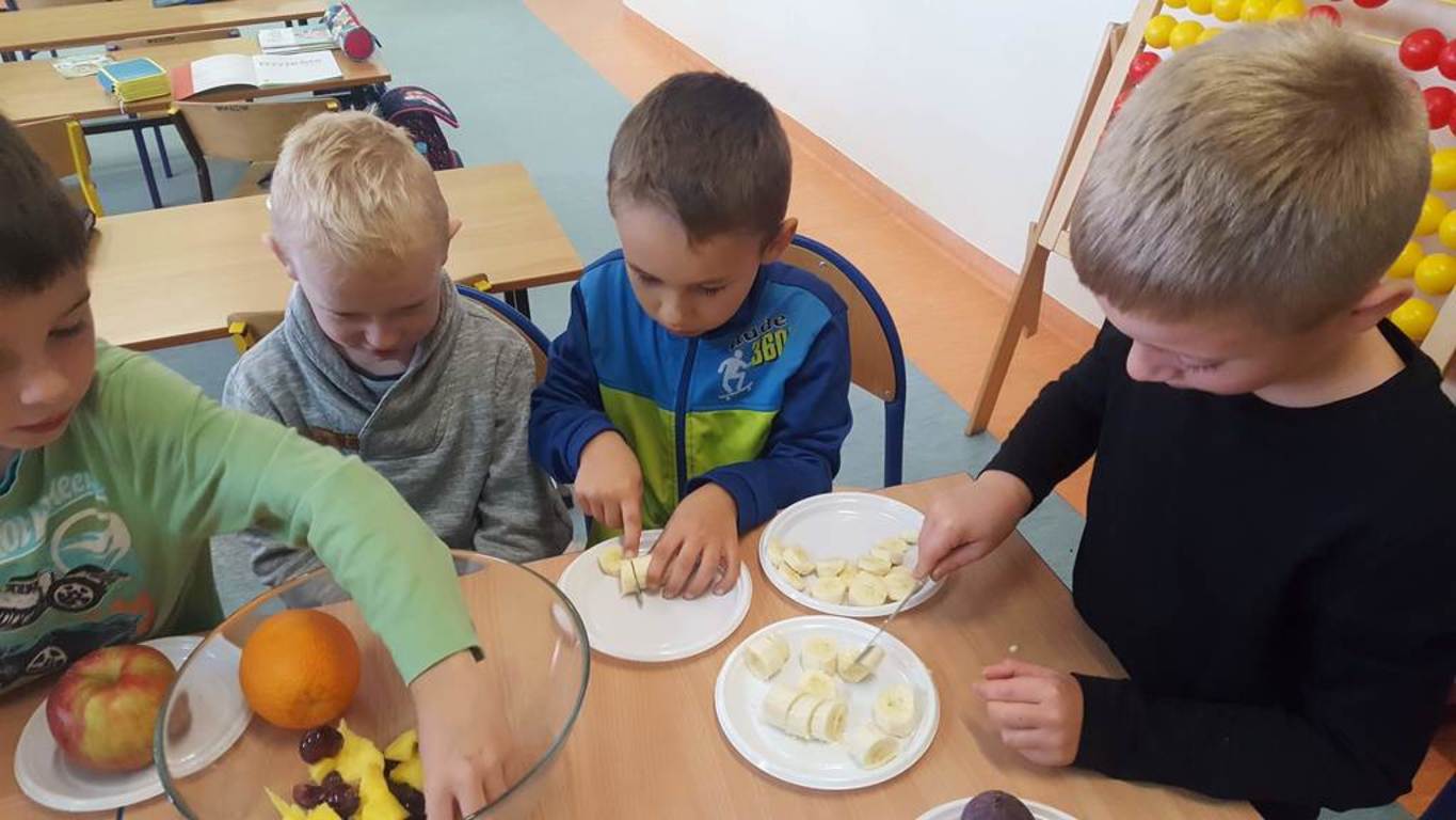 W tym dniu nasi uczniowie poznali jesienne dary ogrodu i sadu, wykorzystując przy tym swoje zmysły. Aby było ciekawiej na stole pojawiły się również owoce egzotyczne. Podczas zajęć dzieci rozwijały umiejętność czytania, klasyfikowania, porównywania. Uczniowie mieli możliwość poznania owoców, których wcześniej nie widzieli. Na koniec wspólnie zrobili pyszną, pełną witamin sałatkę owocową, którą zjedli ze smakiem. W całej klasie unosił się piękny zapach.