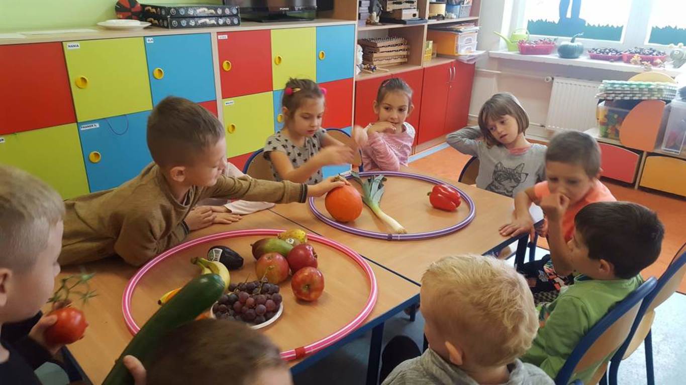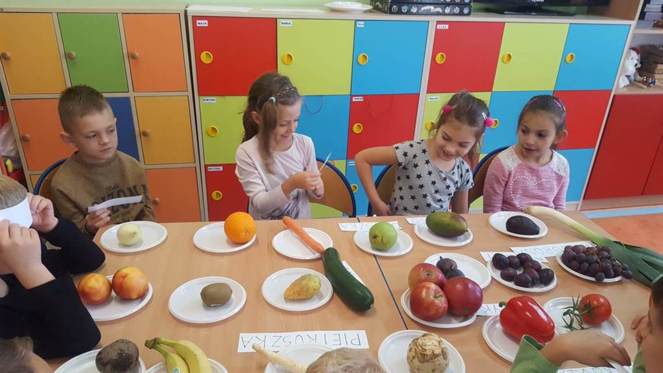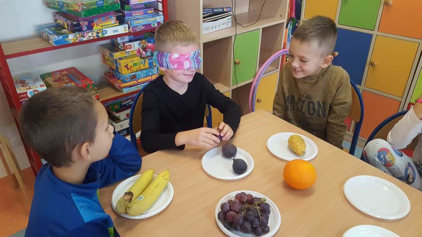 W tym dniu nasi uczniowie poznali jesienne dary ogrodu i sadu, wykorzystując przy tym swoje zmysły. Aby było ciekawiej na stole pojawiły się również owoce egzotyczne. Podczas zajęć dzieci rozwijały umiejętność czytania, klasyfikowania, porównywania. Uczniowie mieli możliwość poznania owoców, których wcześniej nie widzieli. Na koniec wspólnie zrobili pyszną, pełną witamin sałatkę owocową, którą zjedli ze smakiem. W całej klasie unosił się piękny zapach.