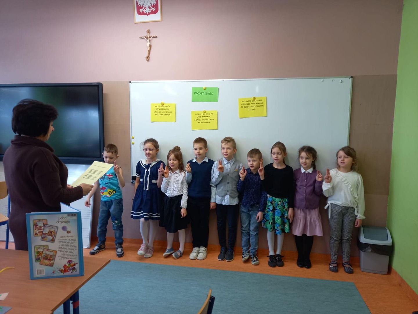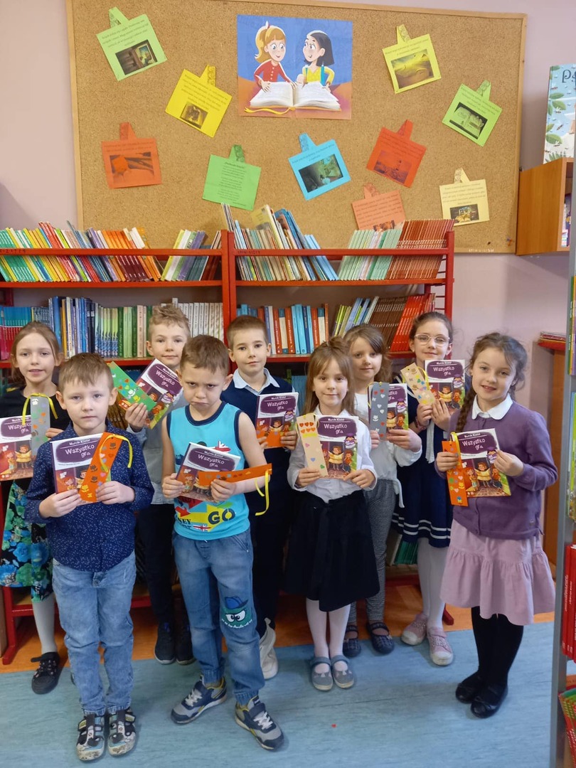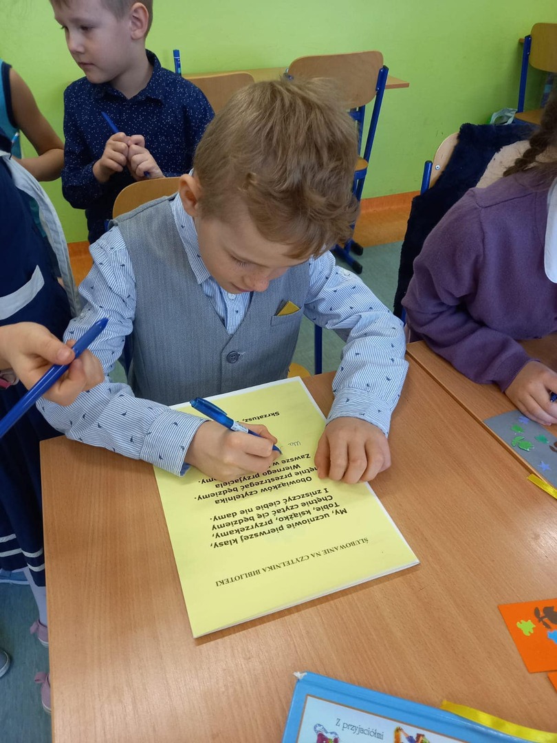 14.03.2023r. pierwszoklasiści zostali zaproszeni do biblioteki. Tam musieli wykonać zadania: rozwiązać zagadki dotyczące bajkowych postaci, udzielić odpowiedzi na pytania ze znajomości wiedzy o książce oraz wykonać zakładkę do książki. Pani bibliotekarka opowiedziała o co proszą książki, kiedy się je wypożycza. Po ślubowaniu uczniowie zostali pasowani na rycerzy biblioteki i złożyli swoje podpisy, potwierdzając tym samym znajomość obowiązków czytelnika. W imieniu rodziców wychowaczyni wręczyła książeczki i wszyscy udali się na słodki poczęstunek.